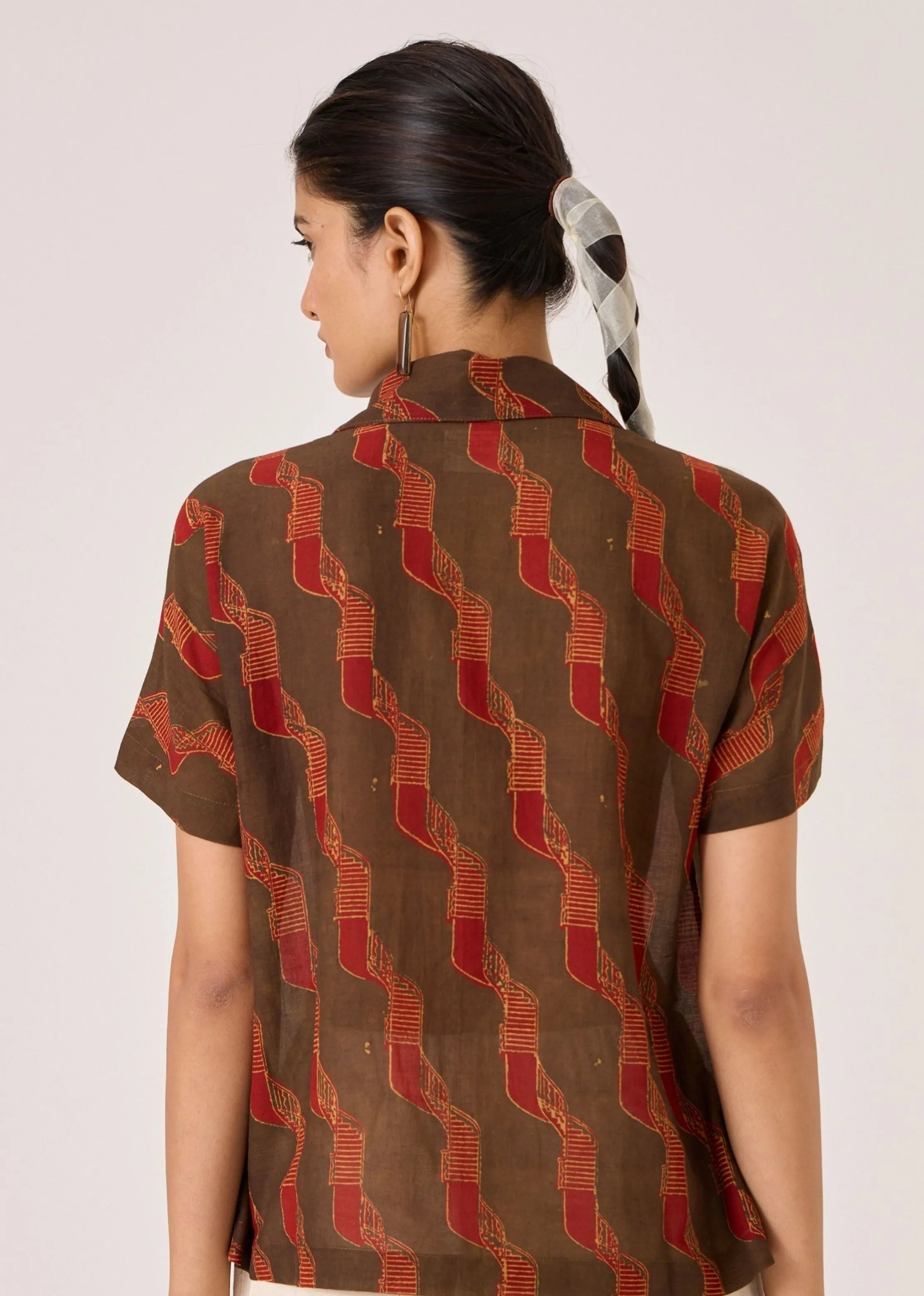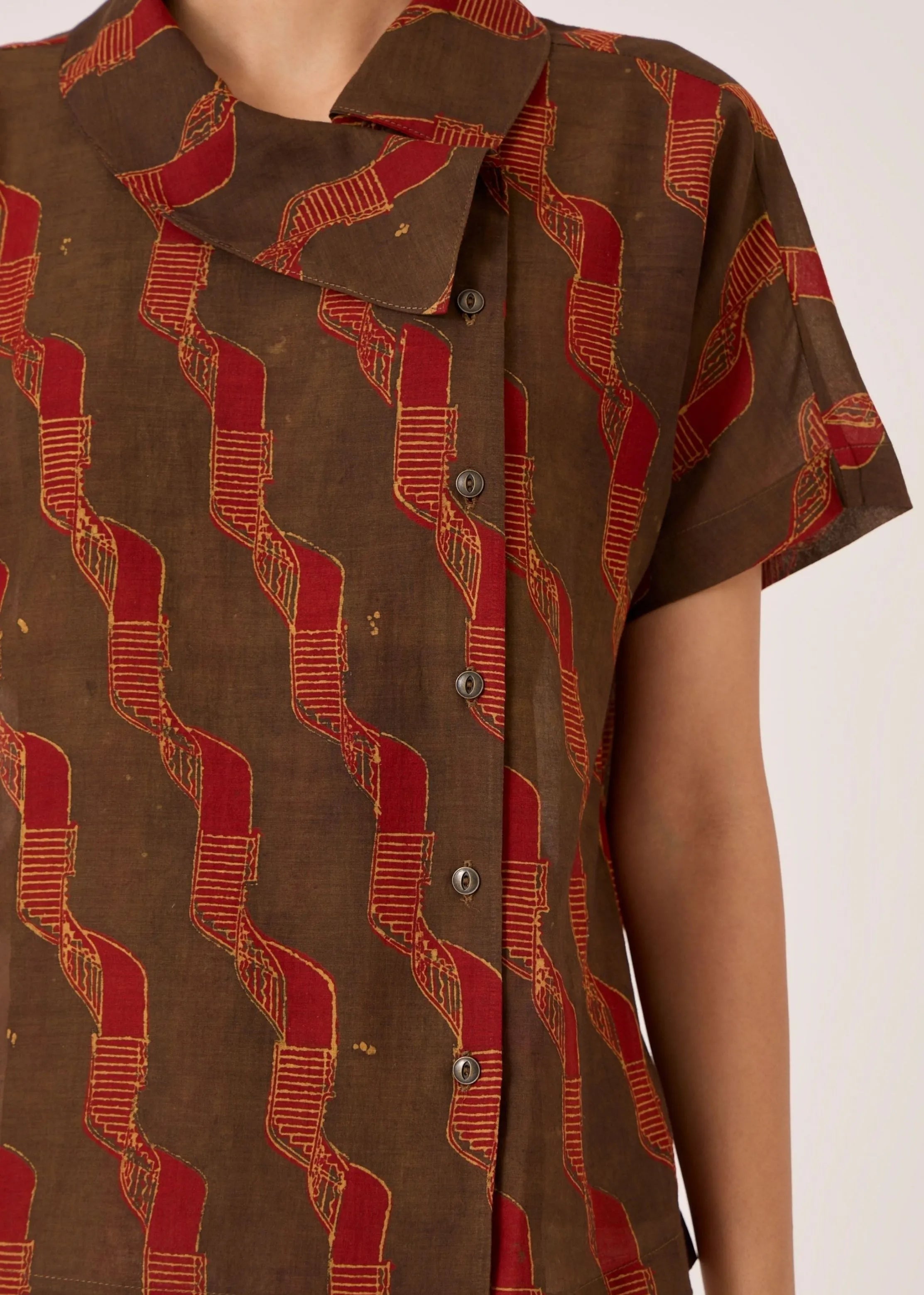 - Desk to dinner fine cotton top - Signature print - Drop shoulder - Off-centre button placket - Raised collar This signature ajrakh block print is designed in our studio and hand block printed by traditional artisans in Gujarat. Print placement may vary from garment to garment. Slight irregularities in print are common and speak to the hand processes involved.