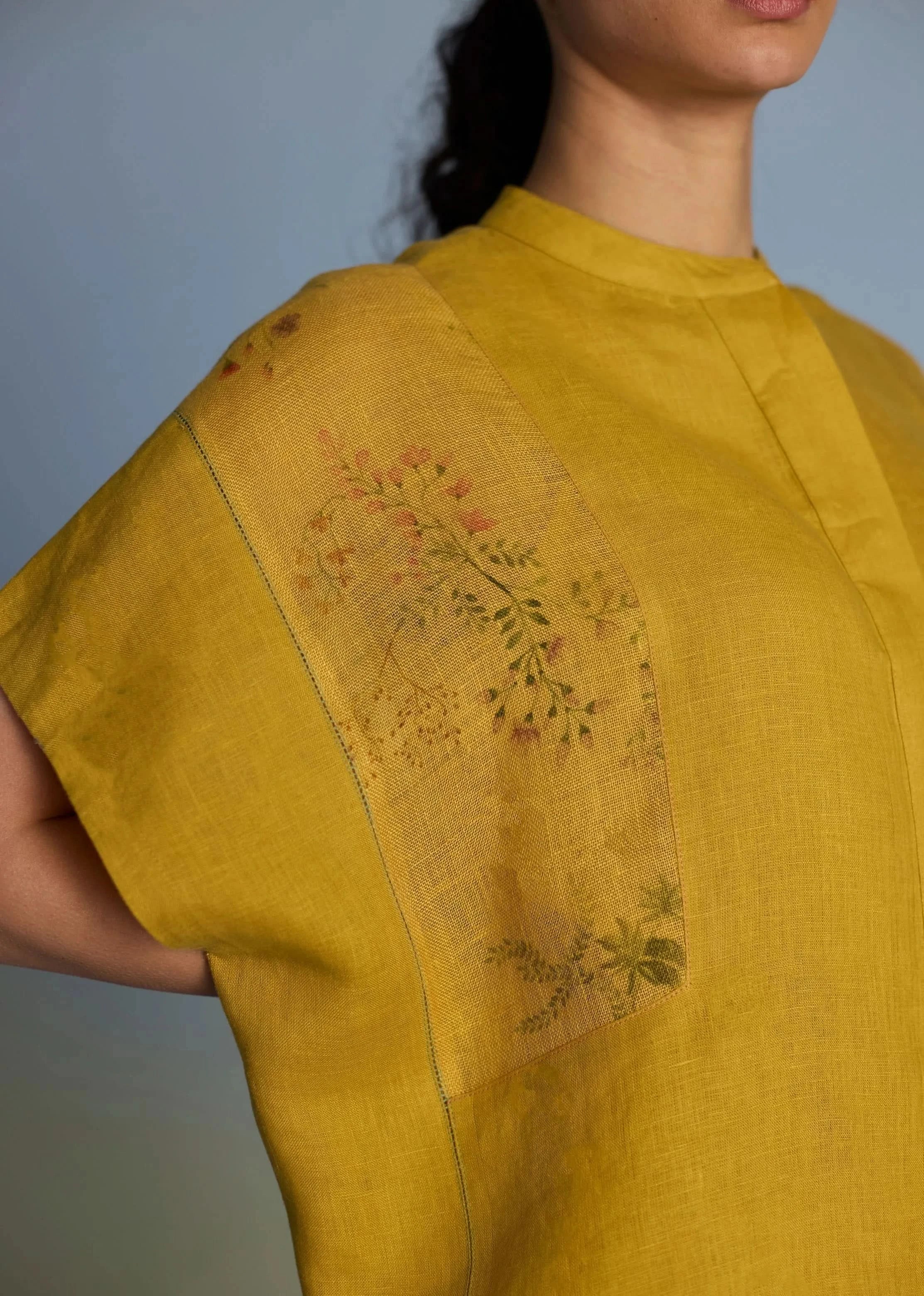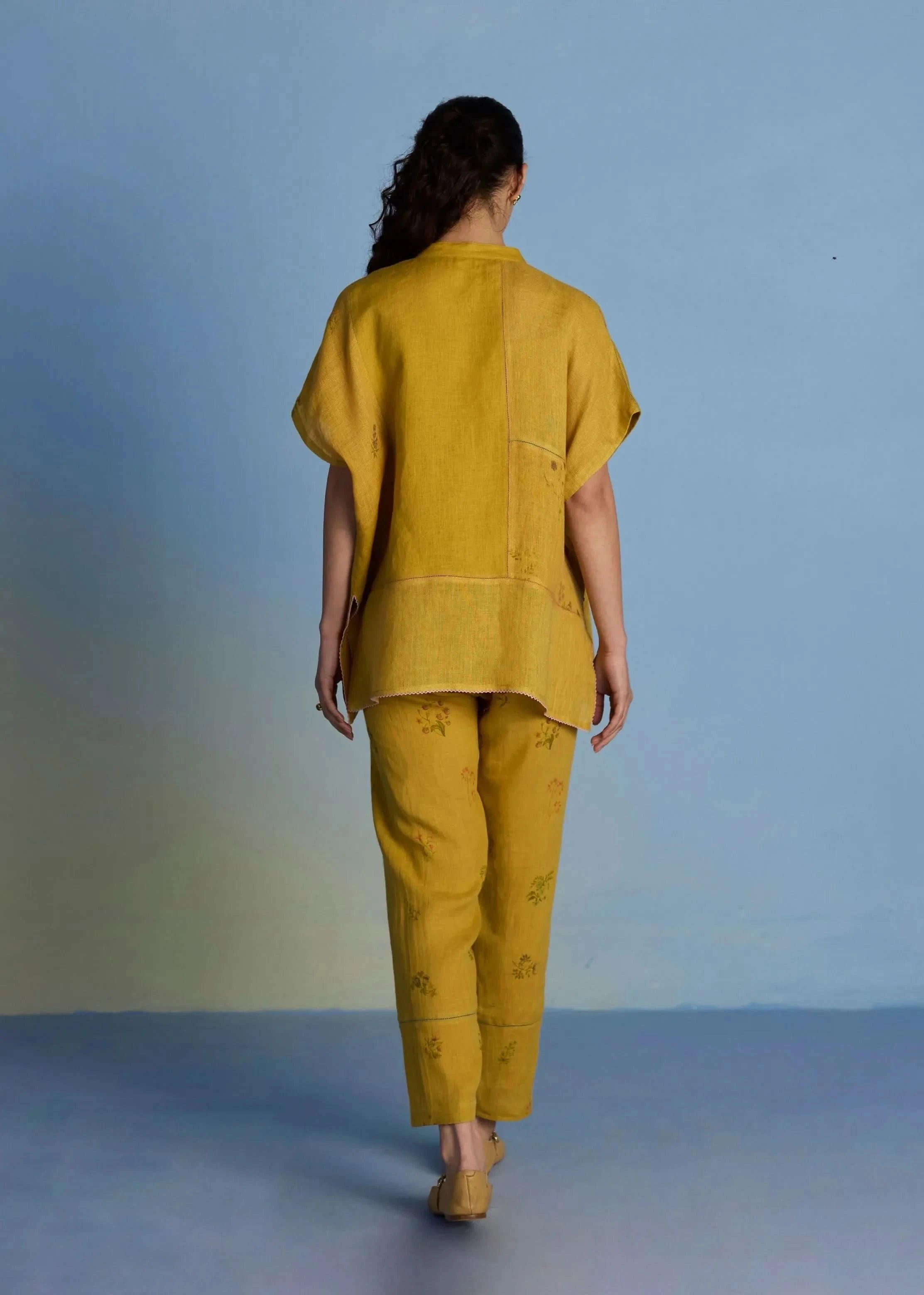 Top - A flowing patchwork shirt crafted via patchwork of our signature soft yarn-dyed linen and sheer linen, featuring an intricate hand-painted floral print. Enhanced with multi-coloured fagotting stitch on adjoining patches, finished with colourful picoting at the hem. Pant- Our forever favourite tapered pants with pockets, an elasticated back waistband and drawstring designed in our signature soft yarn-dyed linen with a hand-painted multi-coloured floral print finished with a faggoting stitch in a pop-coloured thread.