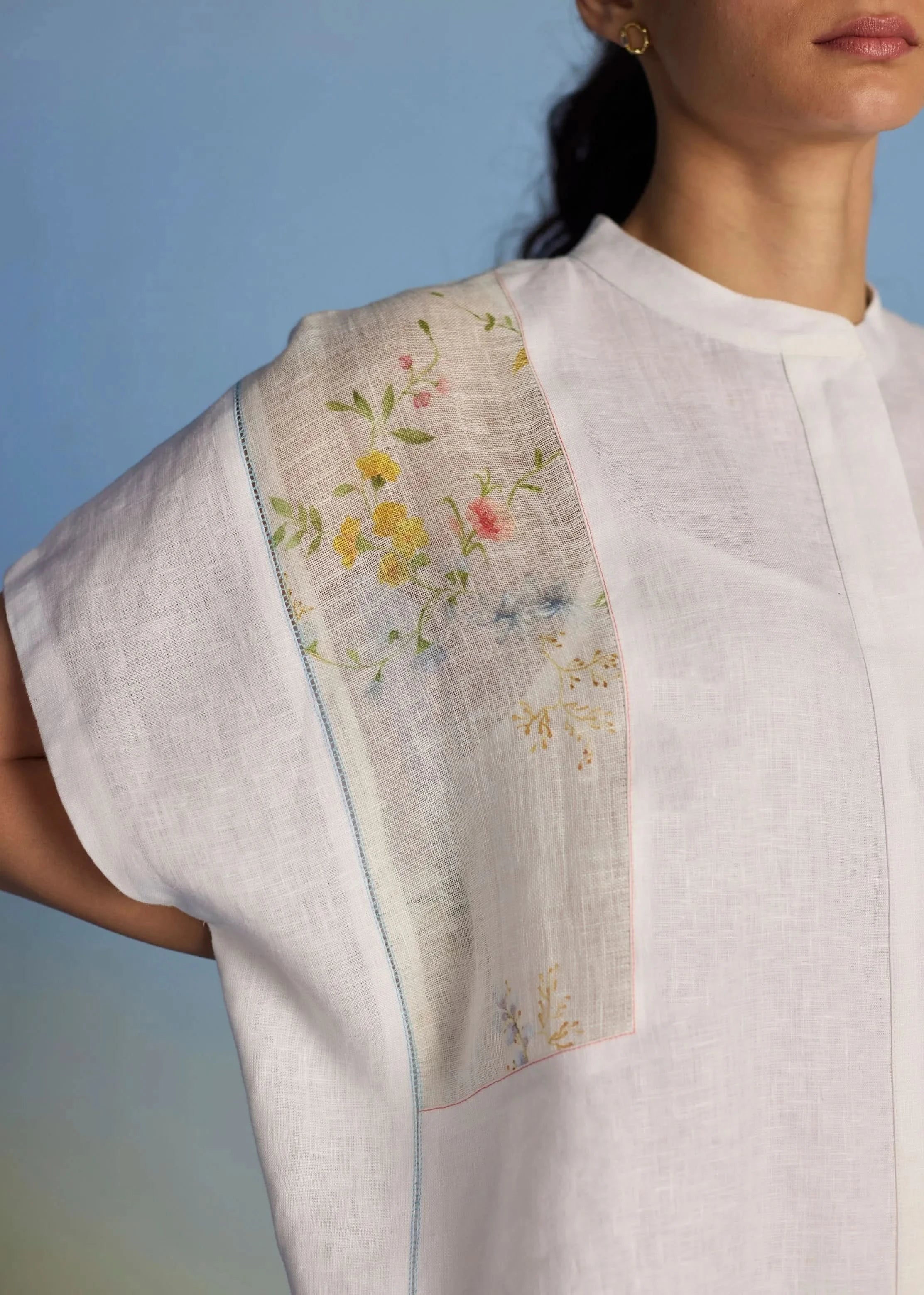 Top - A flowing patchwork shirt crafted via patchwork of our signature soft yarn-dyed linen and sheer linen, featuring an intricate hand-painted floral print. Enhanced with multi-coloured fagotting stitch on adjoining patches, finished with colourful picoting at the hem. Pant- Our forever favourite tapered pants with pockets, an elasticated back waistband and drawstring designed in our signature soft yarn-dyed linen with a hand-painted multi-coloured floral print finished with a faggoting stitch in a pop-coloured thread.