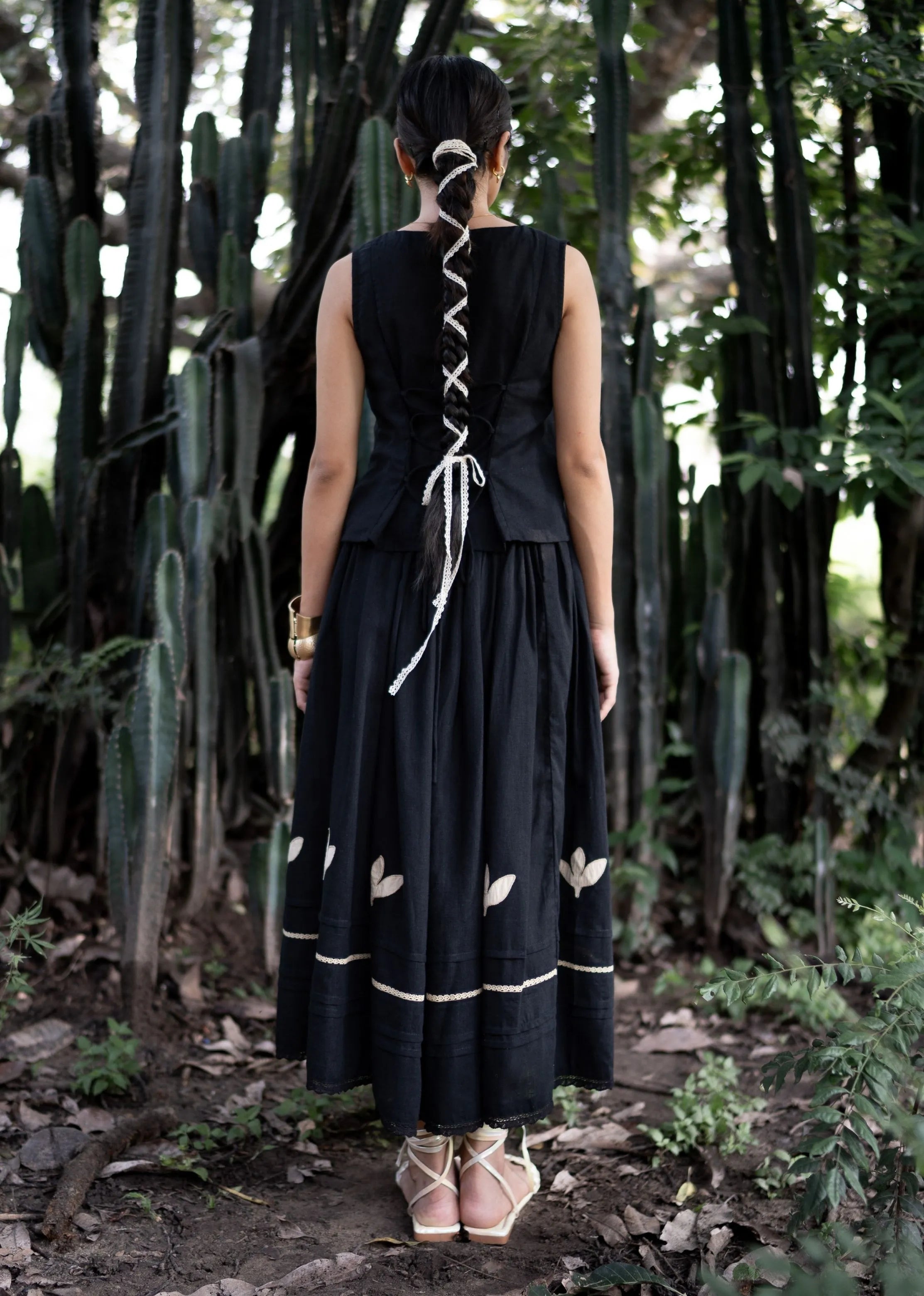 Crafted in breathable linen, this black skirt features intricate appliqué and lace details at the hem. With soft pleats, a comfortable elasticated waist, and a full flared silhouette, it blends artisanal charm with effortless wearability. Paired with hand embroidered linen vest top