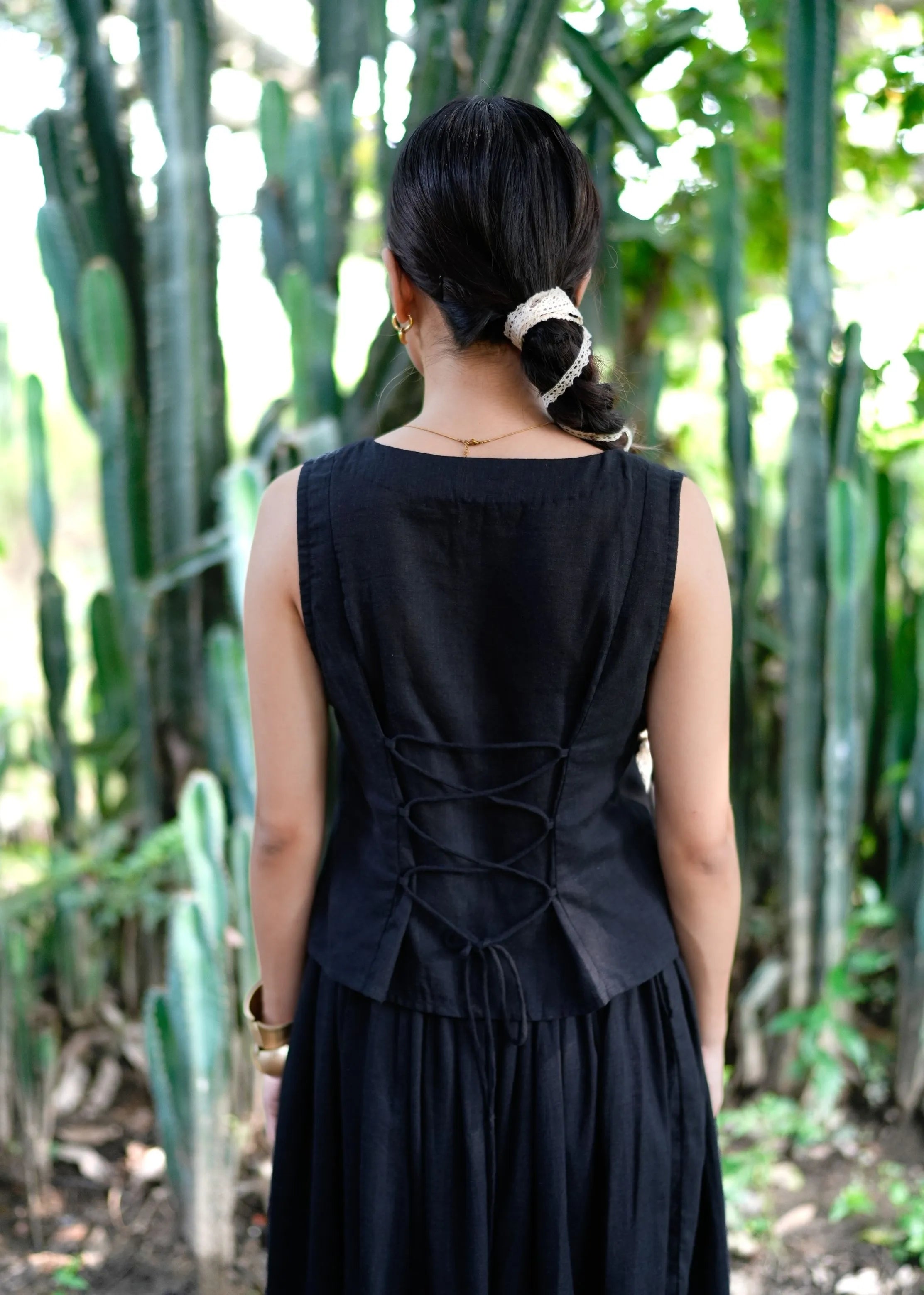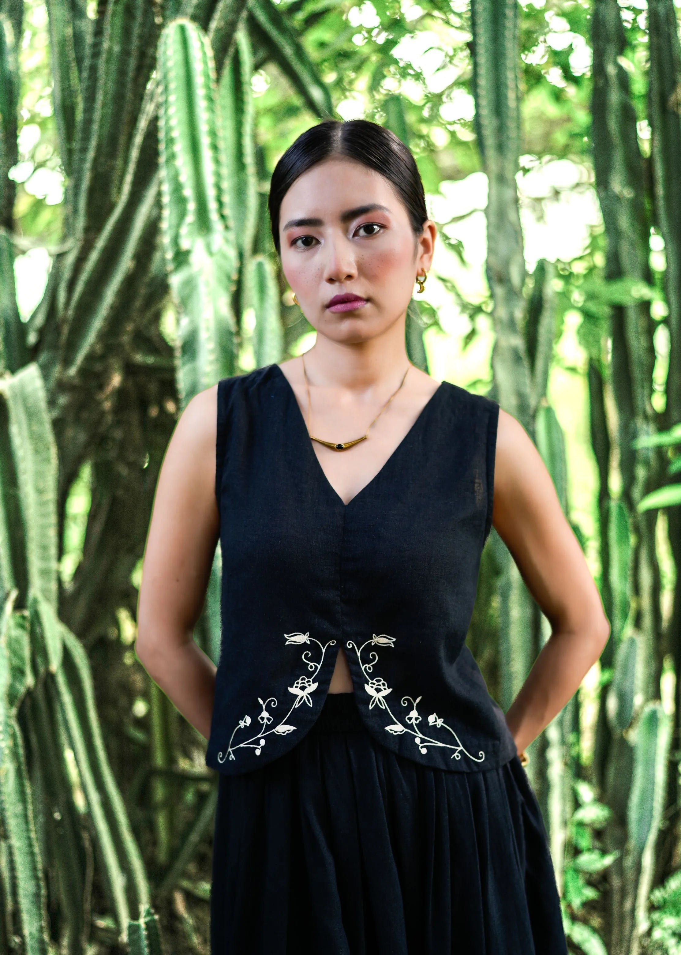 The Alba top is crafted from linen fabric and features a floral hand-embroidered detail on the front, along with a feminine V-neckline. It has an adjustable drawstring back, allowing for a customized fit.