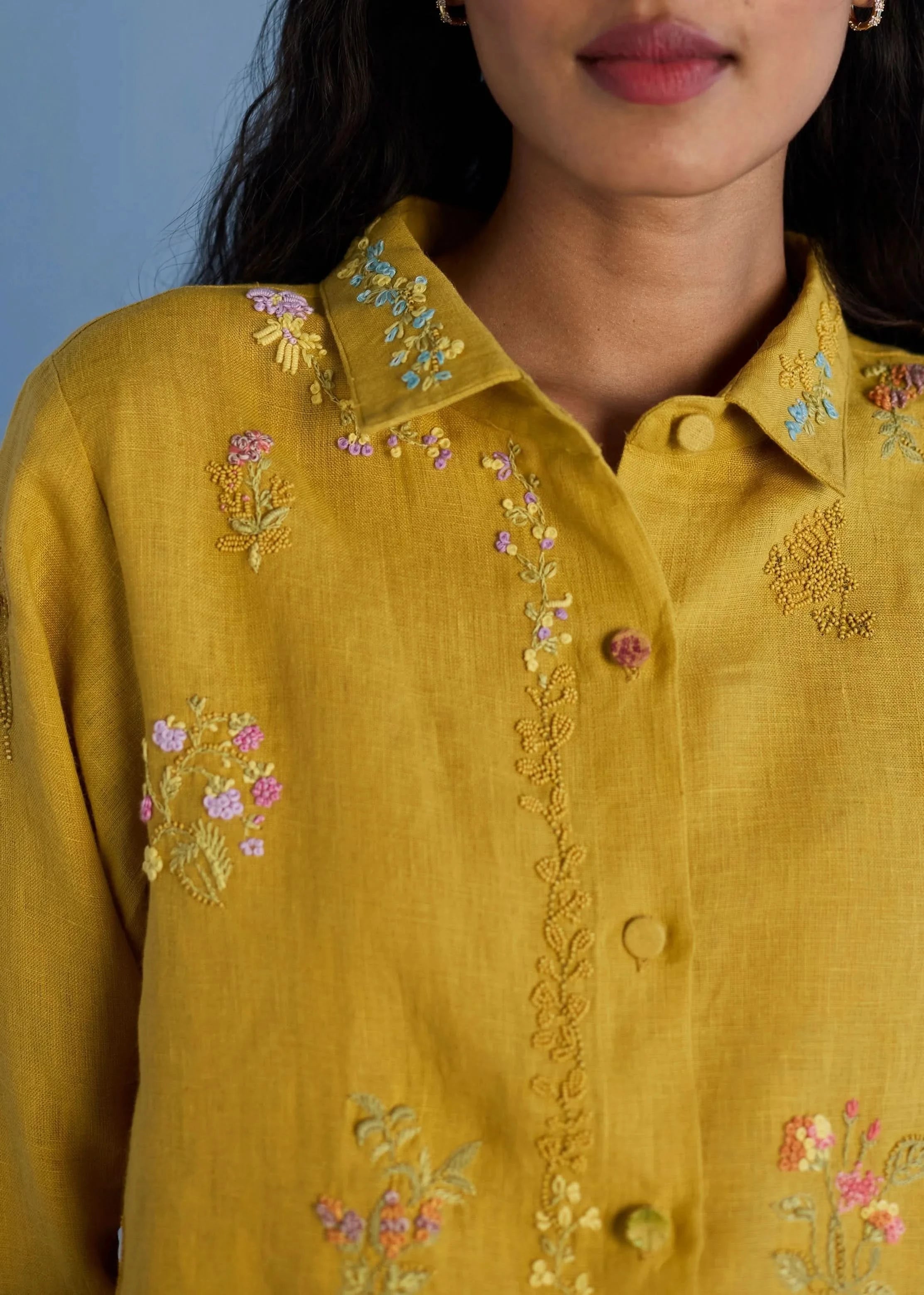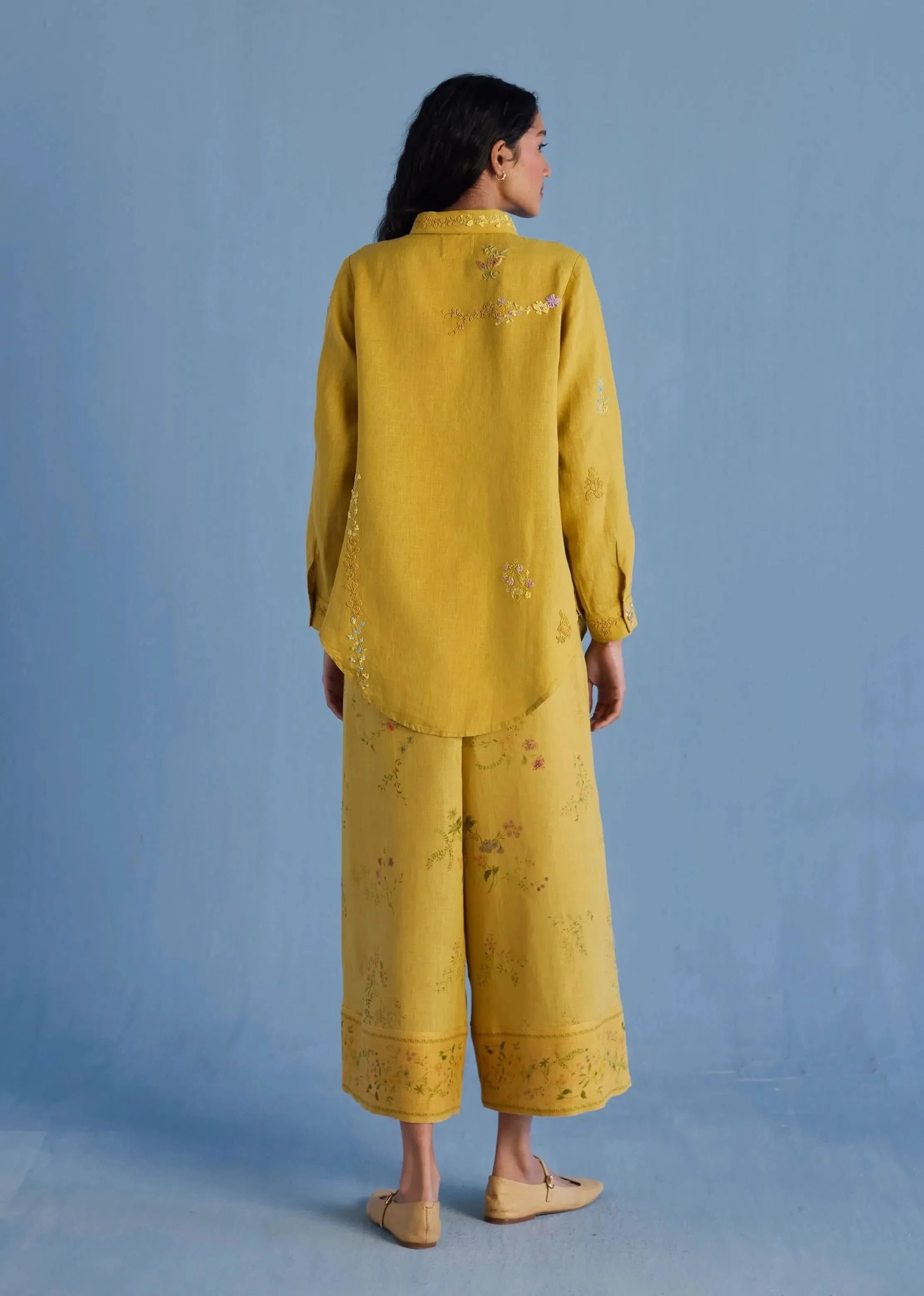 Top - Our favourite statement shirt crafted in our soft signature yarn-dyed linen is meticulously hand-embroidered with delicate, yet textural, floral motifs in mixed materials using multi-colour threads and beads. The shirt is finished with a long side slit detail and floral printed linen buttons. Pant- Classic linen culottes with pleats at the waistband, comfortable pockets and an soft elasticated back waistband in our signature yarn-dyed linen with a hand-painted multi-coloured floral print. The Ama pants are intricately patched with a soft flowing floral border printed sheer linen at the hemline.