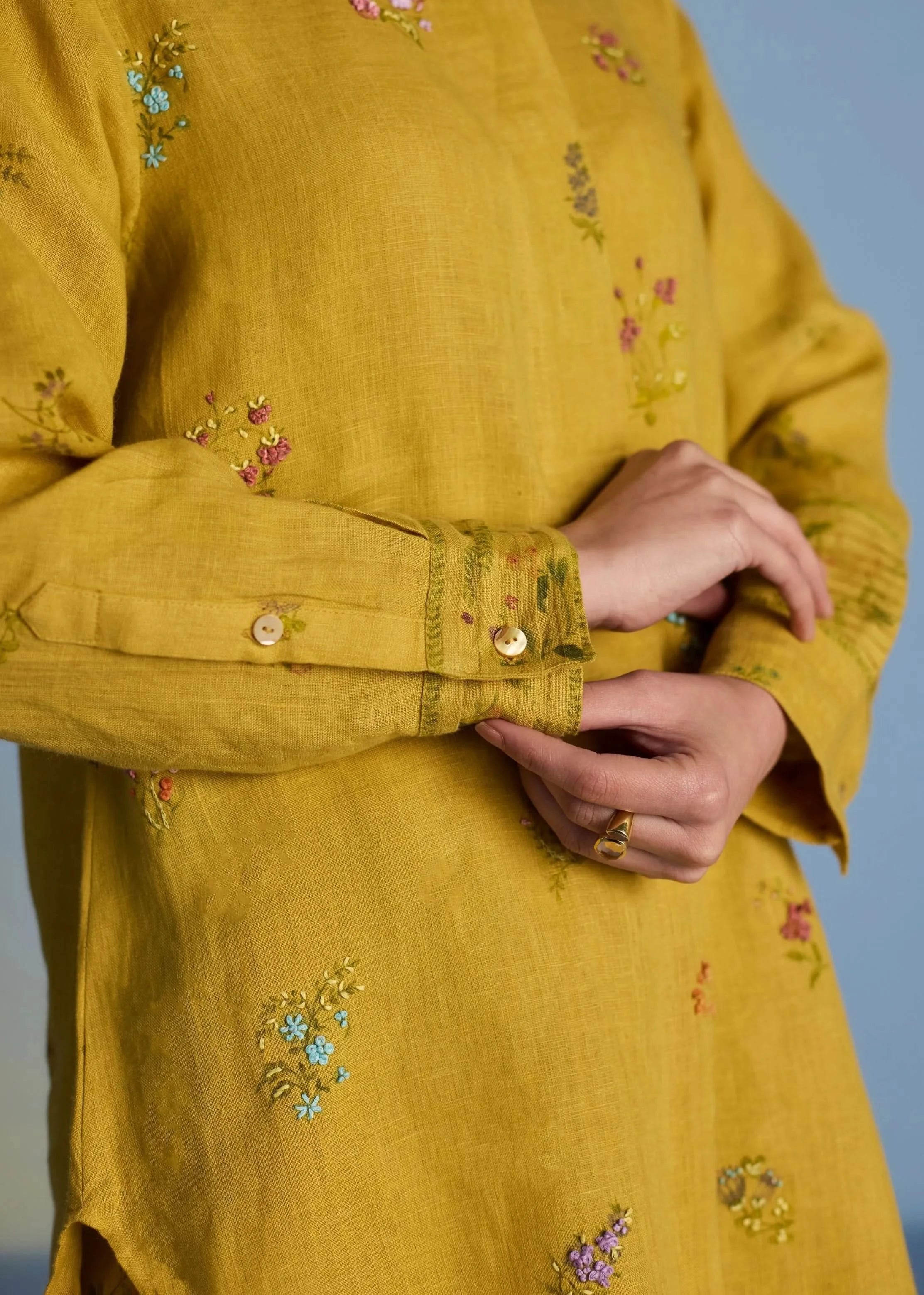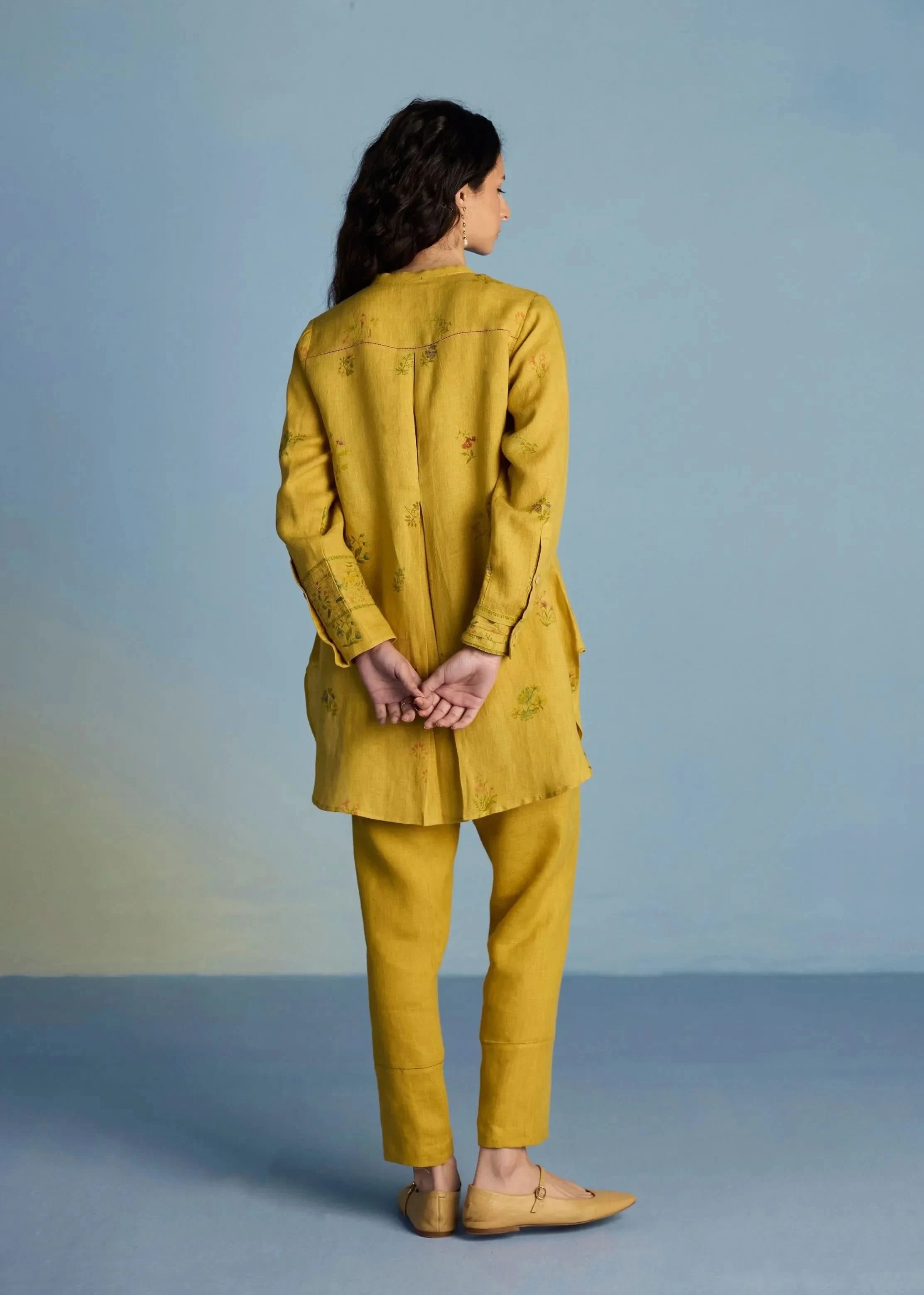 Kurta - A statement short kurta crafted from our signature soft yarn-dyed linen featuring a detailed hand-painted floral print intricately hand-embroidered with beads, zardozi thread work and french knots. The kurta has a concealed placket, a stylized pleat at the back and printed border with pintucks detailing on the sleeves. Pant- Our best-selling ankle length pant crafted from our yarn-dyed linen with a beautiful hand-illustrated floral print. The pant has an elasticated drawstring waist, pockets and intricate pintuck detailing at the ankle.