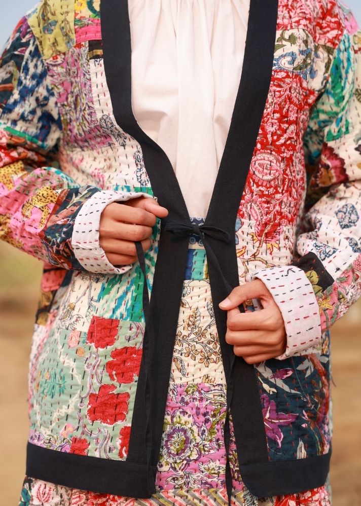 Description: A stunning Kantha patchwork unisex jacket designed in an open-front silhouette with tie-up closures. This hip-length piece features vibrant hand-stitched patterns and a mix of colors, making it a statement layer for any outfit. The contrast trim adds a refined touch to this artisanal creation. Note: Each piece may come with an extra embroidery or patch but the overall look and feel of the piece are not changed. These pieces are a part of a limited edition collection, the stock is made till the raw material is available.