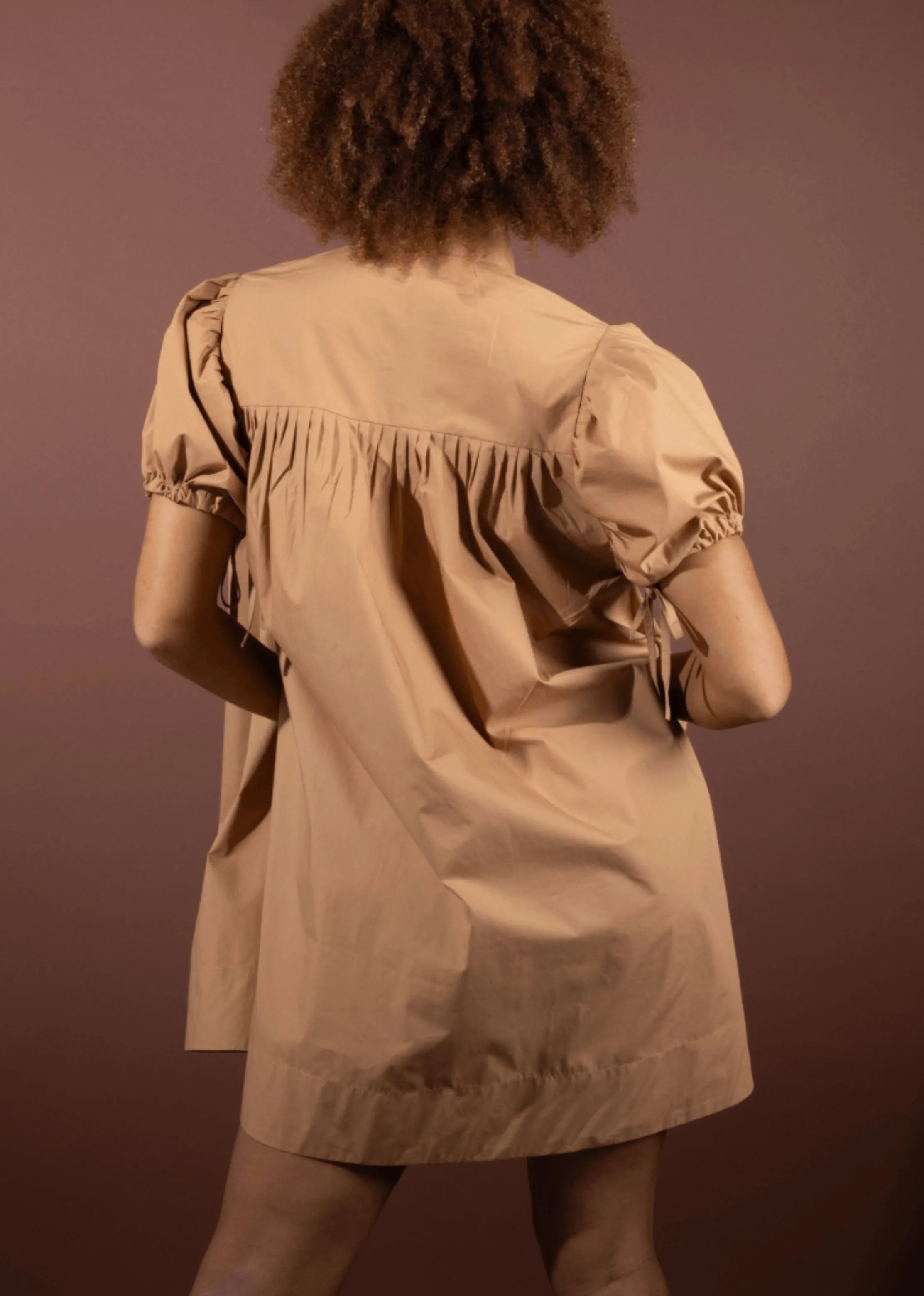 Ayanna Midi dress is a beautiful dress in GOTS Certified organic cotton poplin. It has a Mandarin collar with a slit and ties. It has pleating details on the body and sleeves that is adjustable. Country of Origin- UAE Designed in a loose silhouette that gives you freedom of movement.