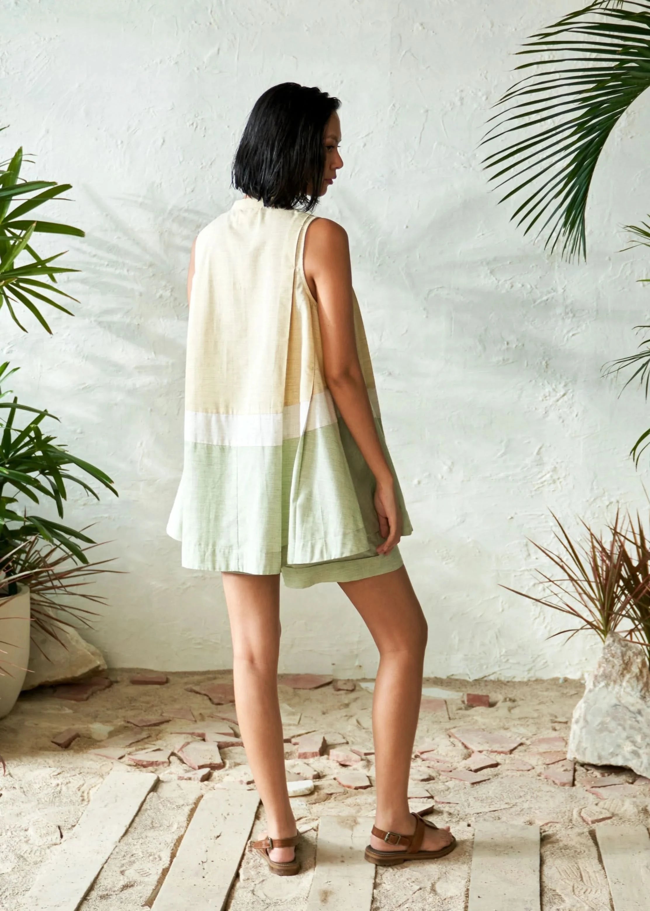 The "Banofi" Coord is a playful and vibrant ensemble featuring a striking lime yellow and natural-hued color-blocking pattern. The top, adorned with delicate shoulder pleats, doubles as an independent short dress for versatile styling. Paired with mint-colored textured cotton shorts, this set blends comfort and elegance effortlessly. The shorts feature elasticated sides for a snug fit and chic folded hems, making them perfect for sunny day outings.