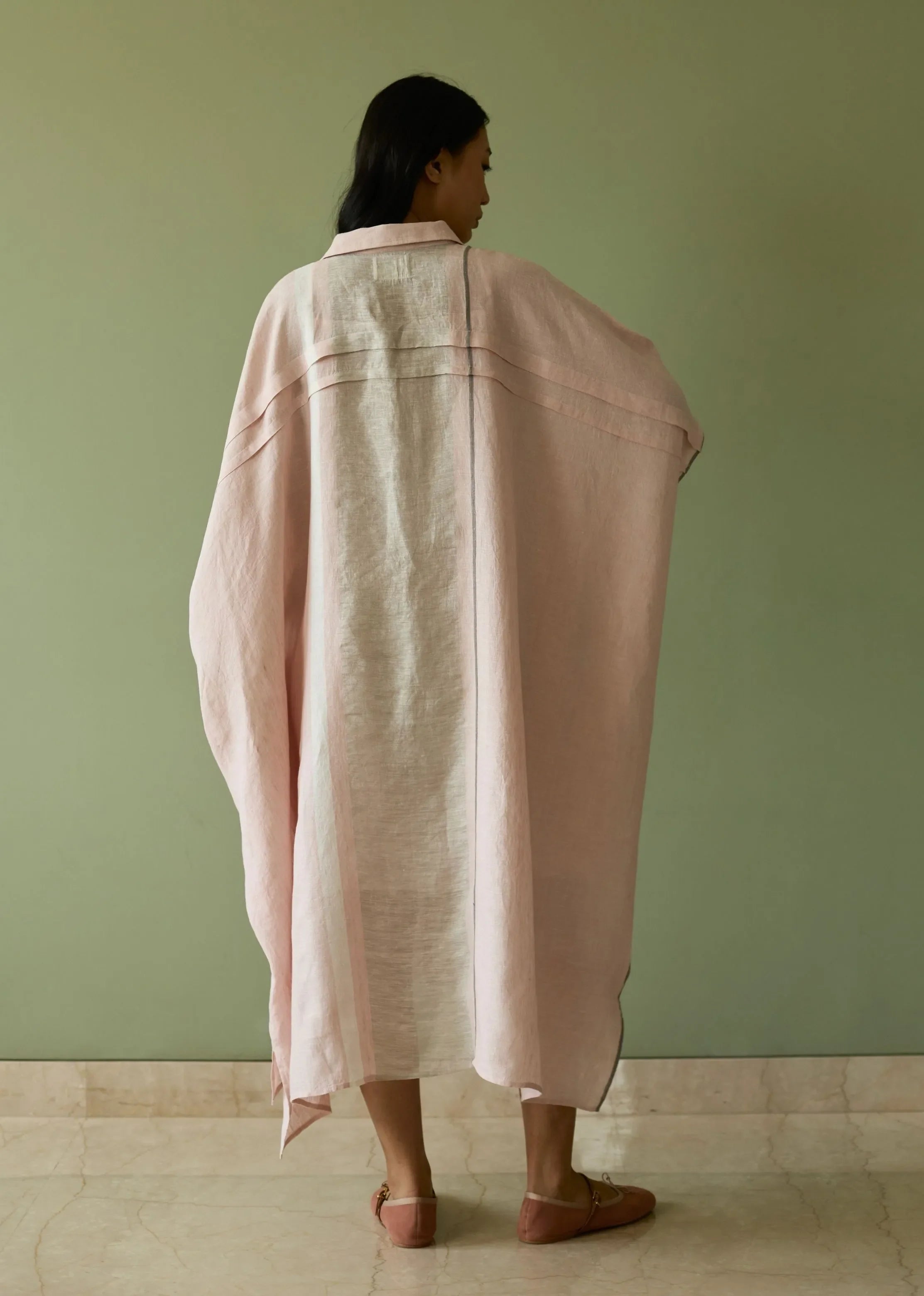 This effortlessly chic colour-blocked kaftan is crafted from our signature soft handwoven metallic border linen, highlighted by a subtle grey selvedge. The relaxed and flowing silhouette features a button-down placket and thoughtful placement of border detailing on the front and back. At the back yoke, soft double pleats add movement and dimension. Finished with mix of linen-covered and luminous mother-of-pearl buttons, this piece is is easy, versatile and statement - all at the same time.