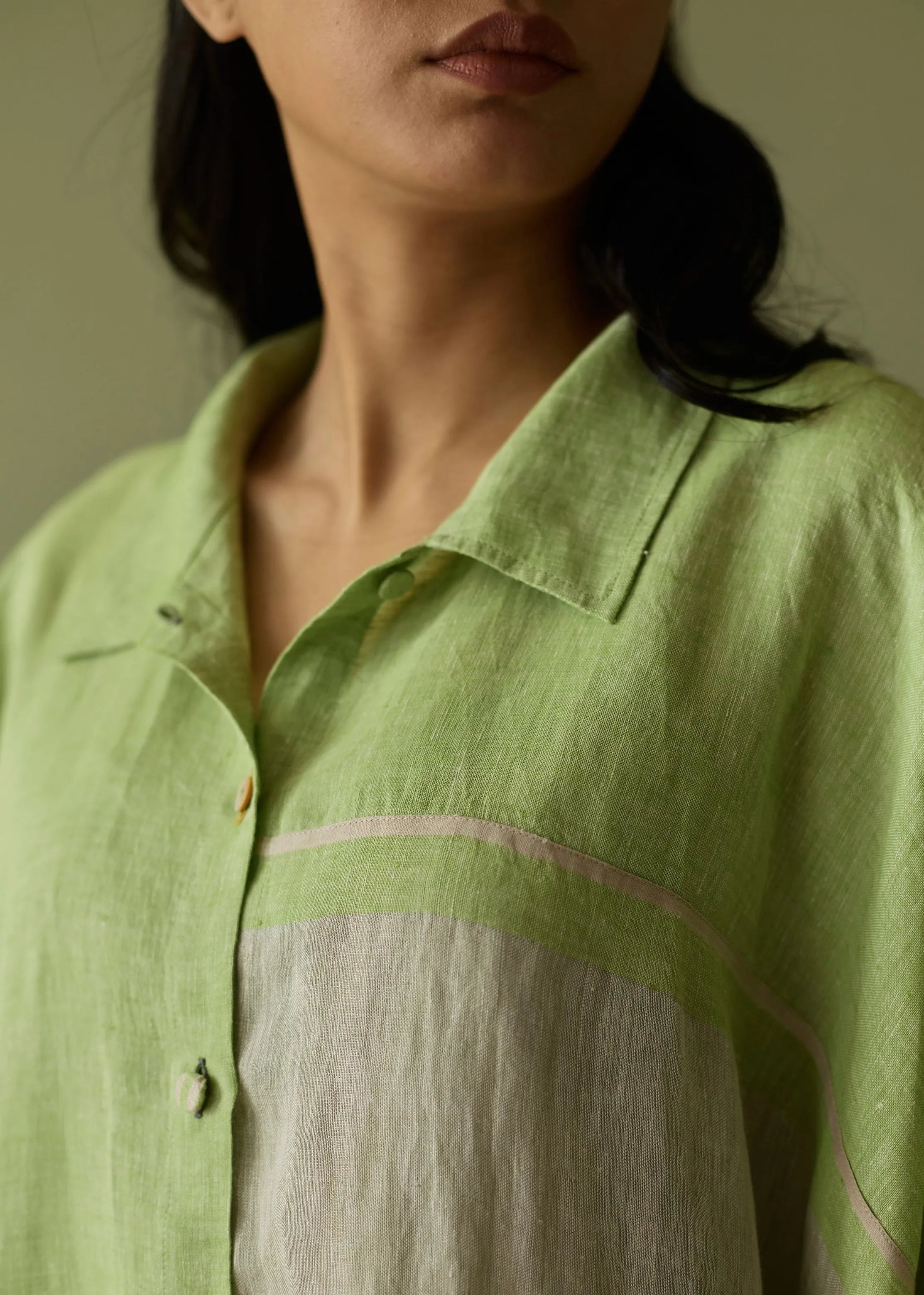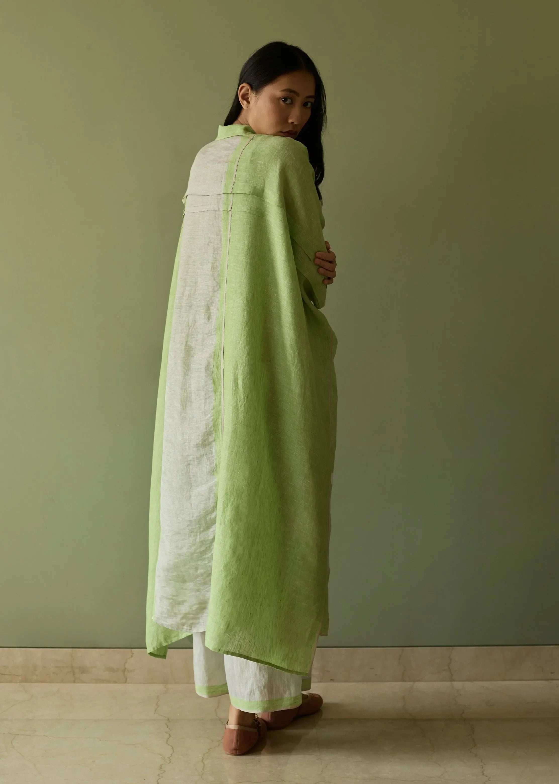 This effortlessly chic colour-blocked kaftan is crafted from our signature soft handwoven metallic border linen, highlighted by a subtle grey selvedge. The relaxed and flowing silhouette features a button-down placket and thoughtful placement of border detailing on the front and back. At the back yoke, soft double pleats add movement and dimension. Finished with mix of linen-covered and luminous mother-of-pearl buttons, this piece is is easy, versatile and statement - all at the same time.