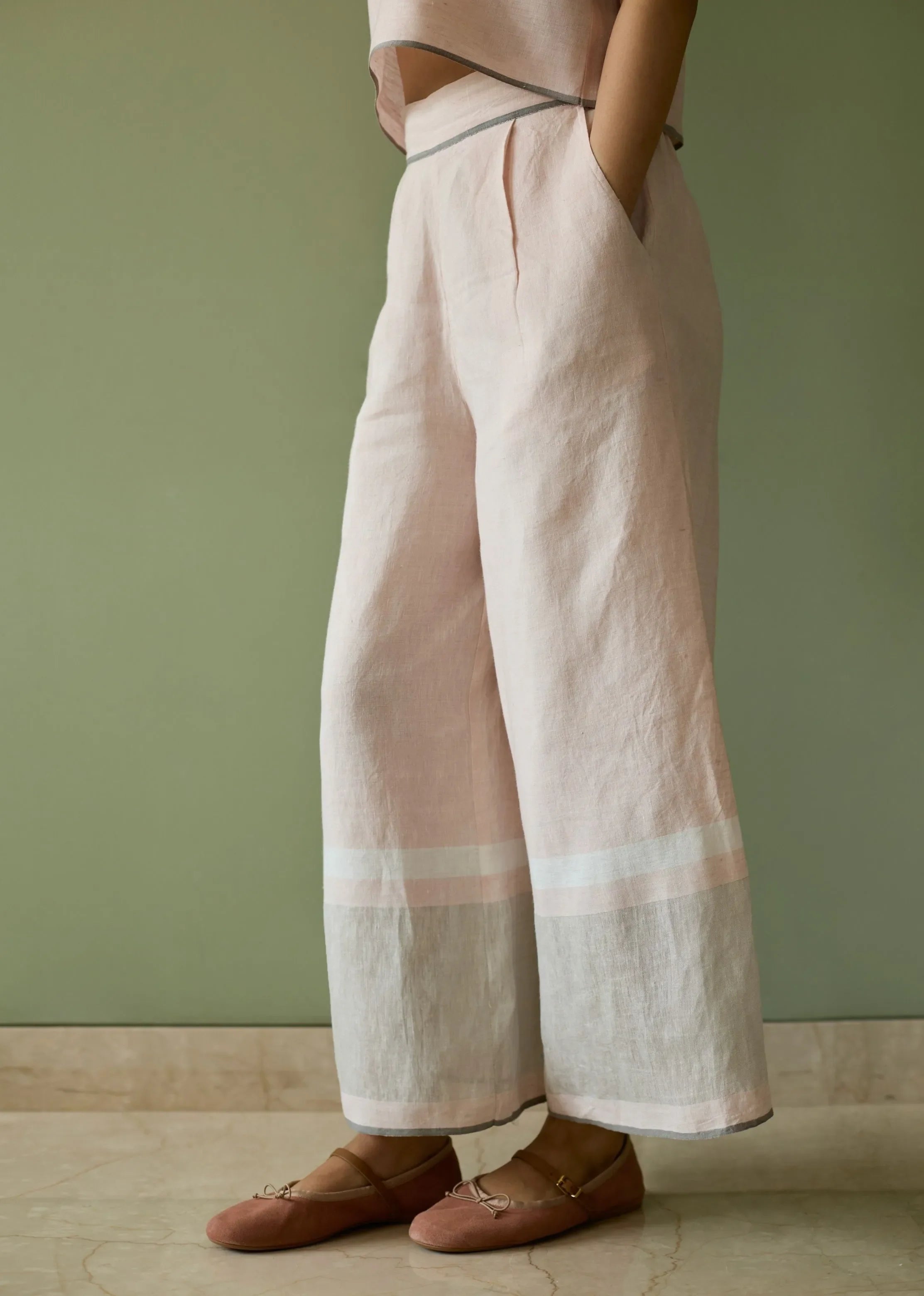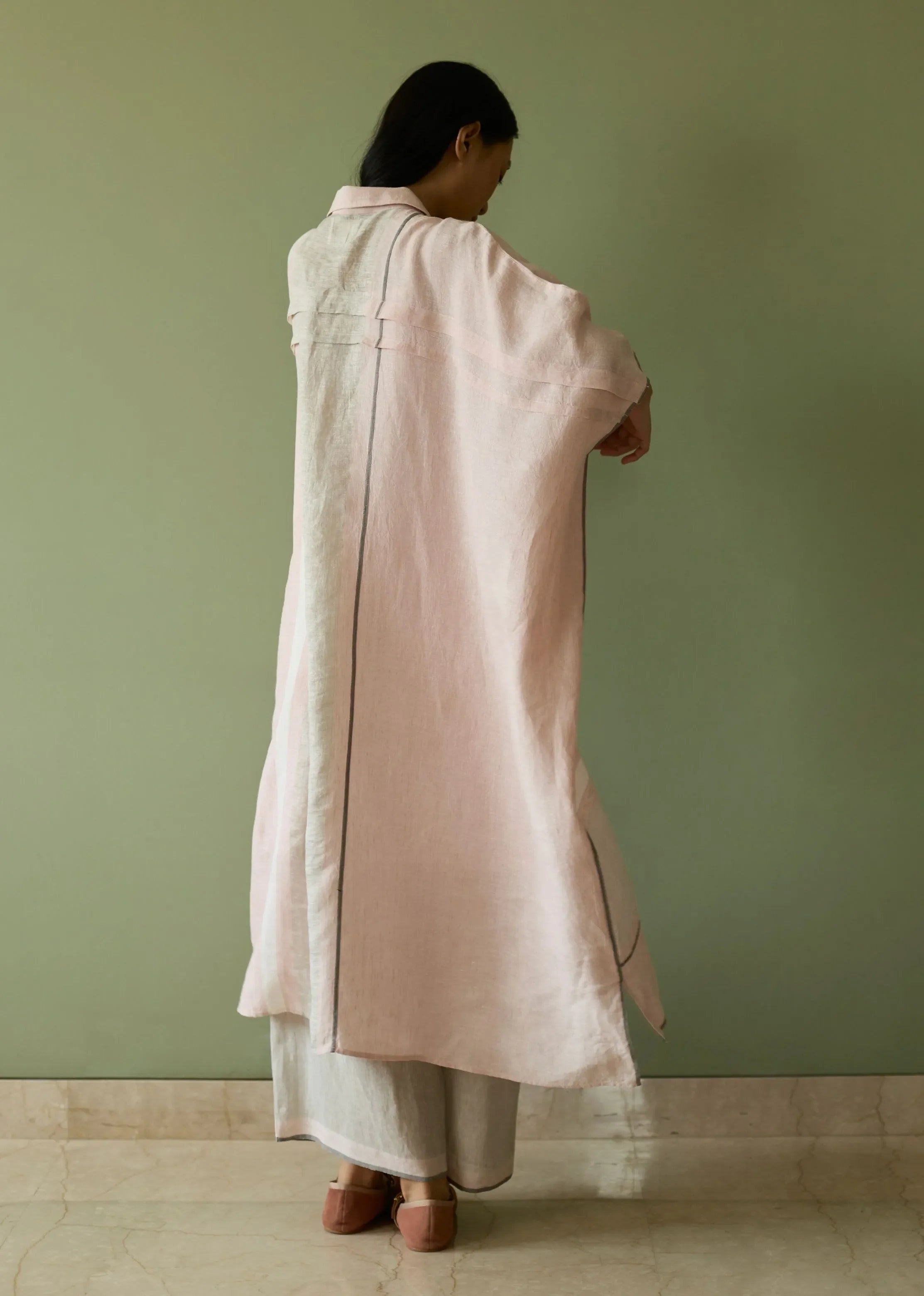 Kaftan Top - This effortlessly chic colour-blocked kaftan is crafted from our signature soft handwoven metallic border linen, highlighted by a subtle grey selvedge. The relaxed and flowing silhouette features a button-down placket and thoughtful placement of border detailing on the front and back. At the back yoke, soft double pleats add movement and dimension. Finished with mix of linen-covered and luminous mother-of-pearl buttons, this piece is is easy, versatile and statement - all at the same time. Pant - Timeless linen culottes with pleats at the waistband, comfortable pockets and a soft elasticated back waistband in our signature soft handwoven metallic linen.