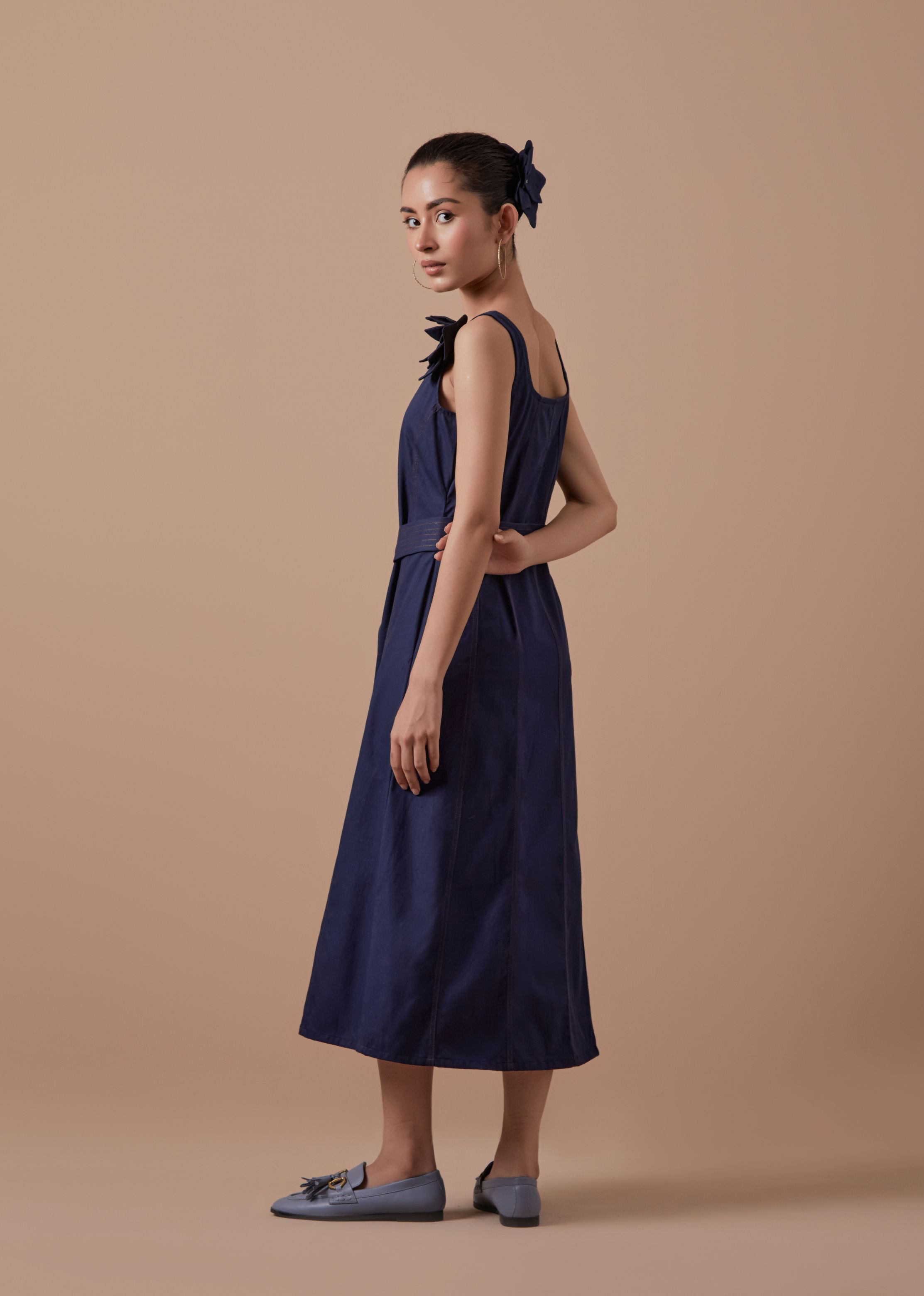 THE BOSS DRESS is a stylish and refined sleeveless midi dress with feminine and functional elements. It features contrast topstitching that accentuates its paneled construction. This dress blends modern elegance with a vintage-inspired charm, making it suitable for day events, casual occasions, or even creative workplaces.