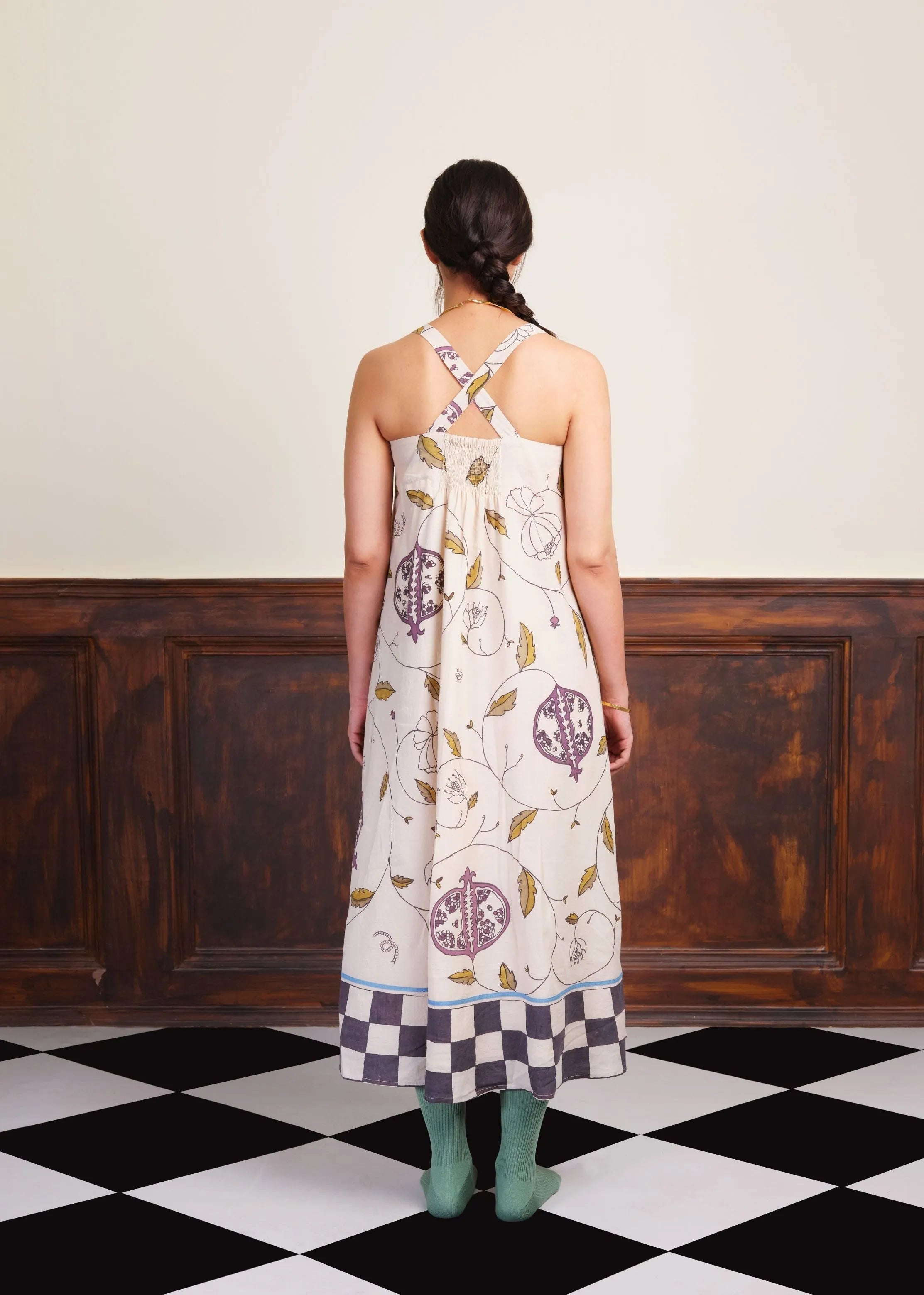 A strappy A-line relaxed dress with a cross back and a shirred back panel. It is painted with myrobalan, alum, lac, and kassim. It also has a small indigo blue patch running above the kassim border. Shell and lining made with 100% cotton.