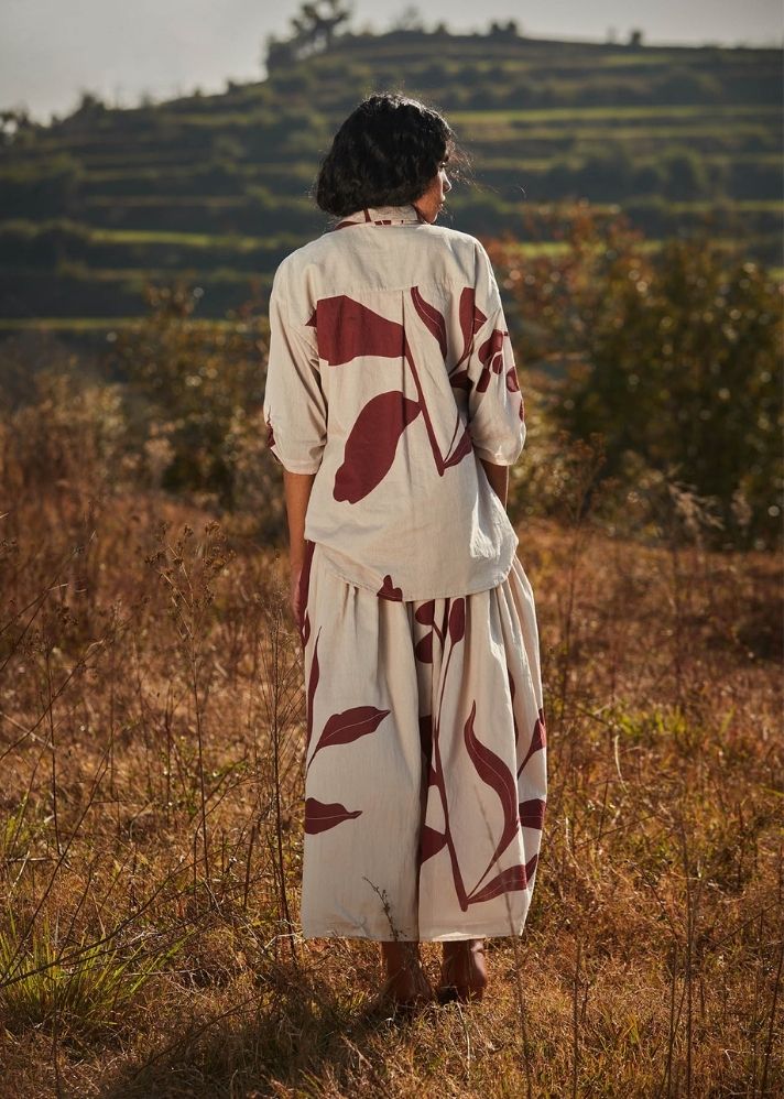 No Return No Exchange"Burnt Sienna" is a beige top and skirt co-ord set, featuring a brunette print for a unique touch. Crafted in breathable mul, it is fully lined for comfort, and the skirt is designed with convenient pockets for added functionality. The skirt comes with a elasticated waist belt. Handcrafted in India. Side seam pockets in the skirt. Fully lined. Separate cold water hand wash. No soaking. Or dry clean .