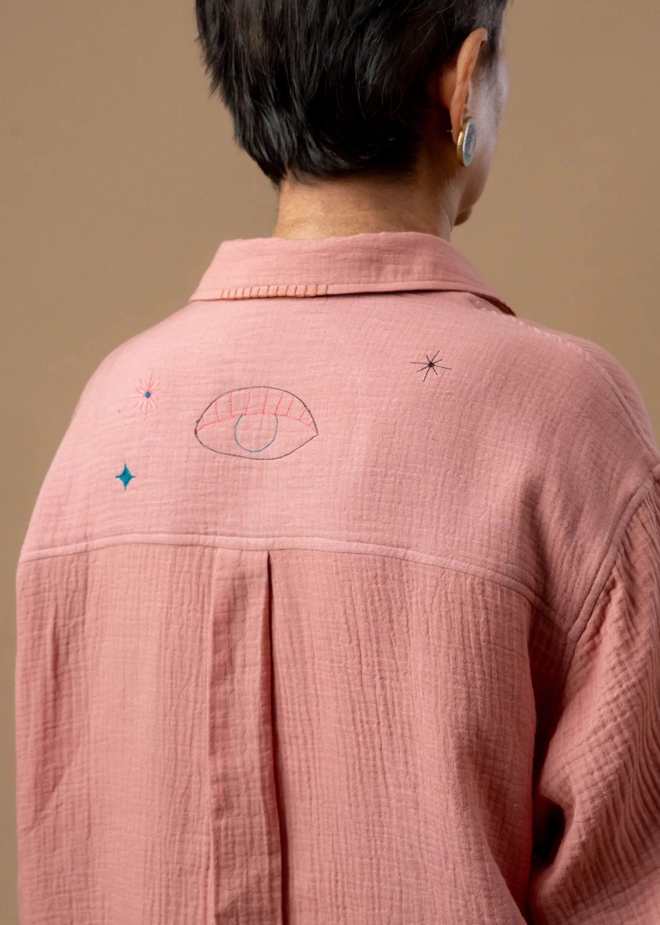 This set includes an oversized organic cotton shirt with a double collar and randomly placed doodle embroidery on the collar, pocket, and hem. It also features flared organic cotton pants with an elasticated waistband, side pockets, and matching doodle embroidery and details. Each piece may come with an extra patch or embroidery to save as much fabric as we can.