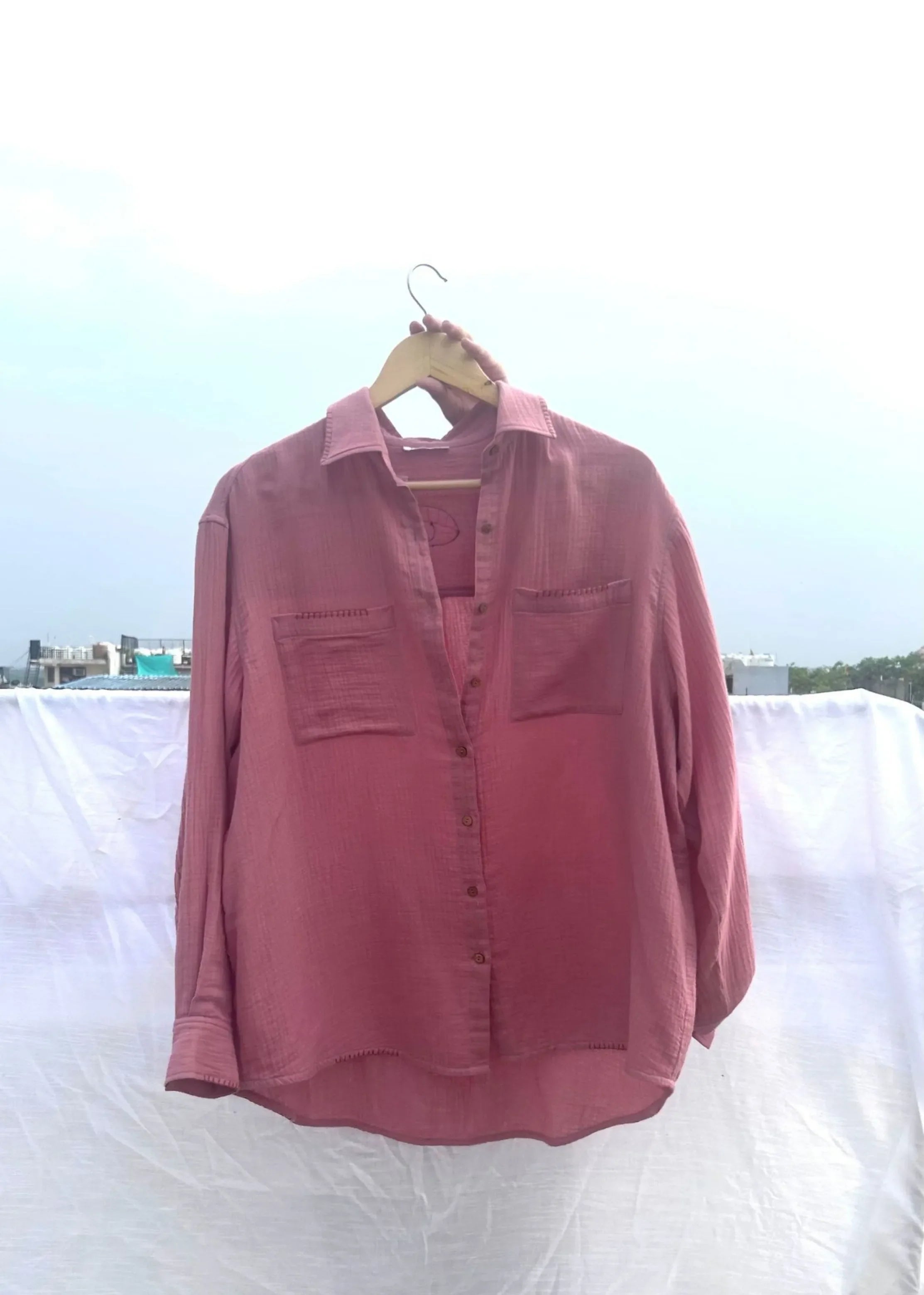 Oversized organic cotton shirt featuring a double collar and randomly placed doodle embroidery with details on the collar, pocket, and hem. Each piece may come with an extra patch or embroidery to save as much fabric as we can.