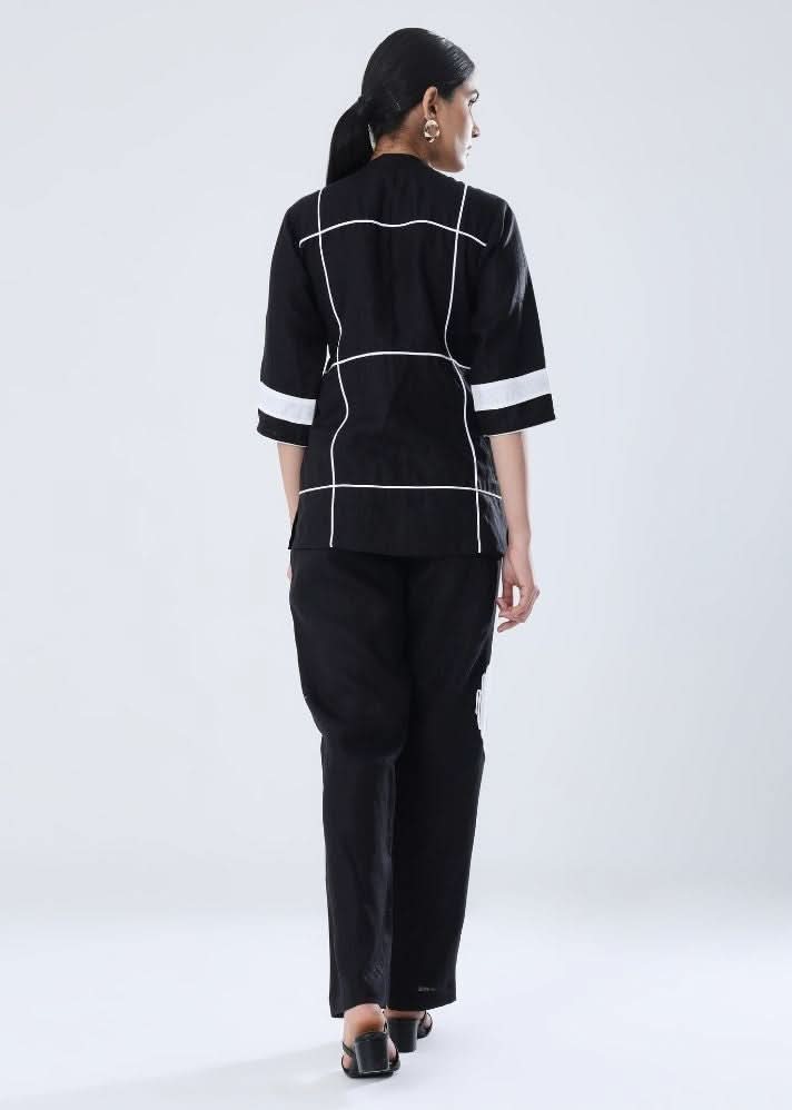 Make a bold yet elegant statement with this CHARCOAL Co-ord SET in 100% Hemp. Designed for comfort and style, this set includes a sleek button-up top and matching straight-cut trousers. The standout feature is the abstract white circular dori embellishment, creating a striking contrast on the deep black fabric. Perfect for casual outings or semi-formal gatherings, this set combines modern aesthetics with timeless appeal.