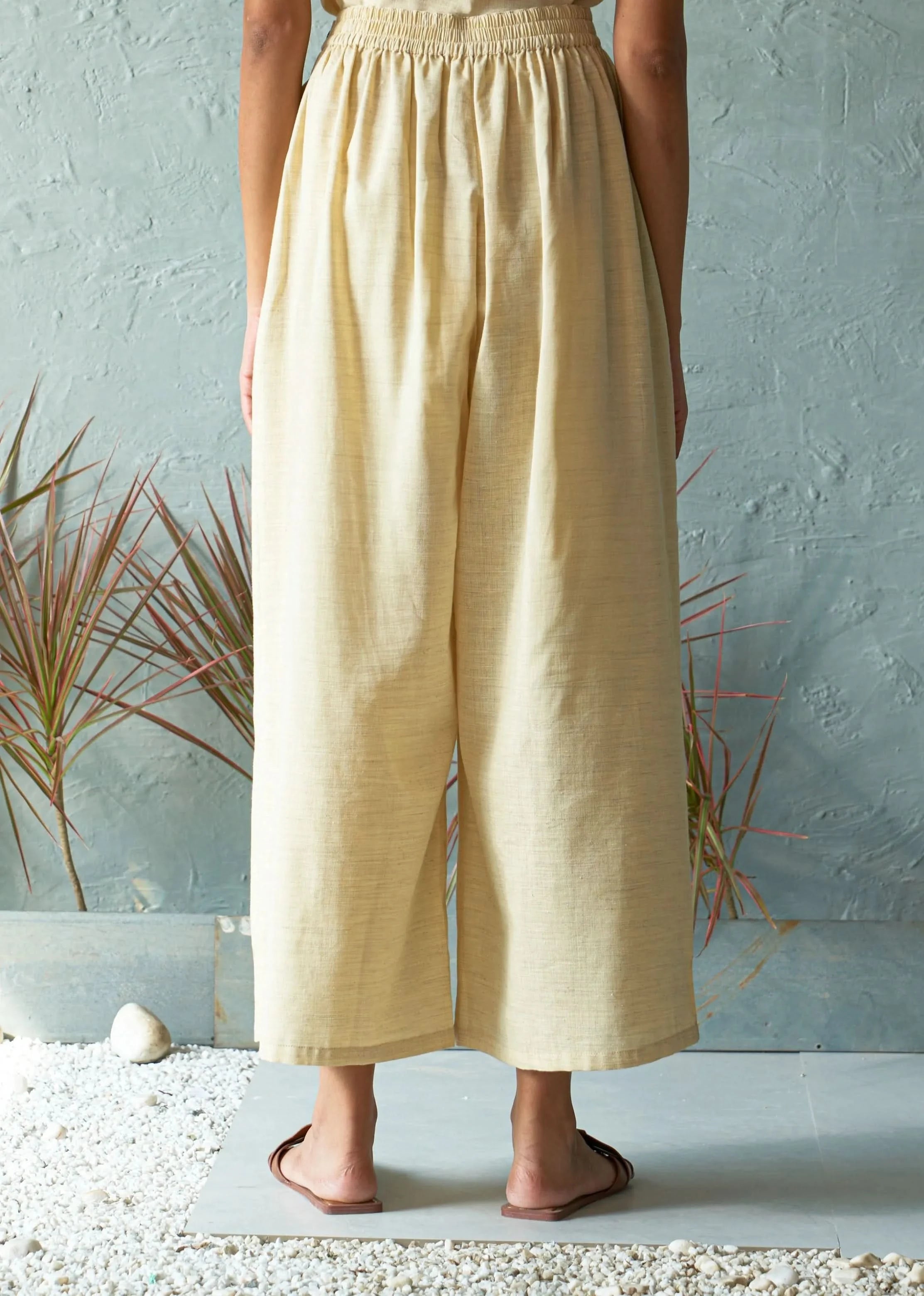 The "Citrus Delight" pants are a vibrant and stylish addition to your wardrobe, crafted from textured cotton in a refreshing lime yellow hue. These ankle-length pants feature a front belt, back elasticated waistband for a tailored yet comfortable fit, and pleated detailing for added elegance. The wide-leg opening adds a breezy, modern touch, making them perfect for casual or semi-formal occasions.