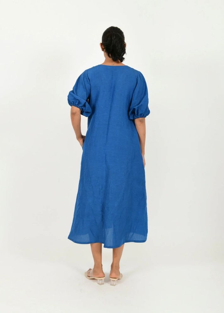 Classic Blue Cotton Dress With Puffed Sleeves in 100% Organic Cotton / Gots Certified fabric. Surface technique involved - DYED