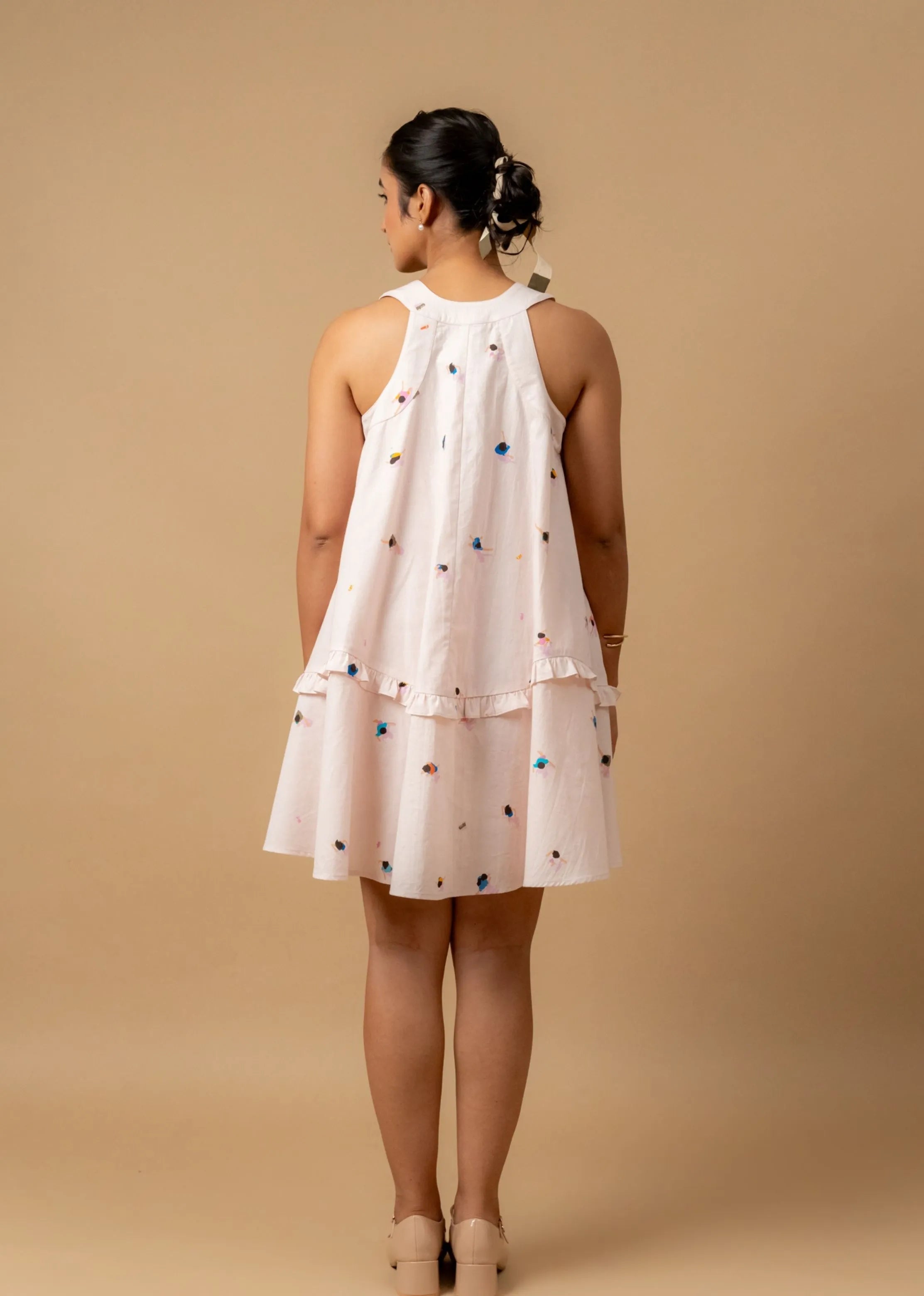 Exaggerated A-line short dress with frill, racer back dress comes with side pockets. Each piece may come with an extra patch or embroidery to save as much fabric as we can.