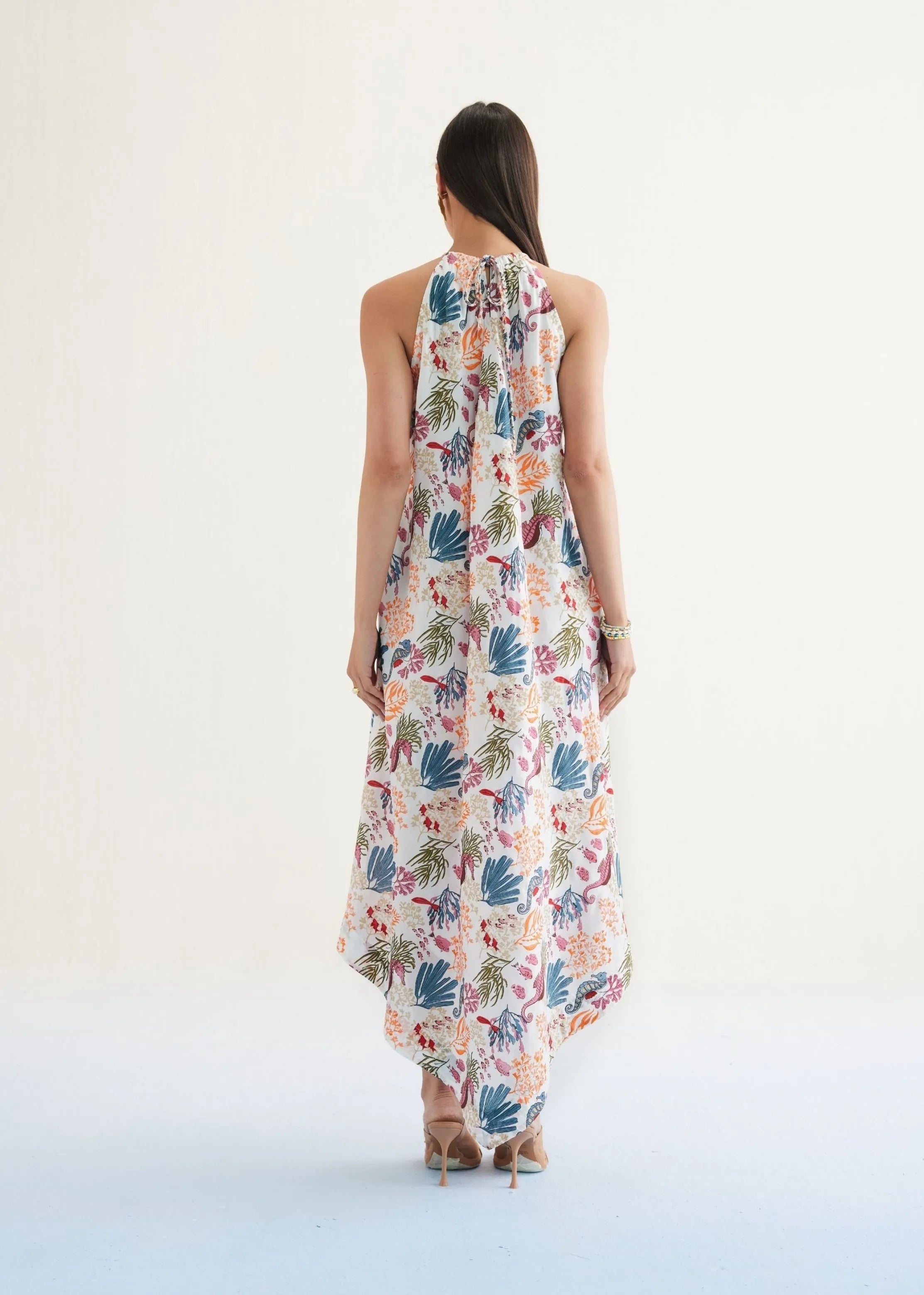 Relaxed fit, halter neck, sleeveless, a-line, maxi dress crafted in lyocell fabric, screen printed with our signature ocean life inspired motif using azo-free dyes. This elegant dress is the perfect holiday look - something you can celebrate all your precious moments in, staying light as a feather through it all, but it's also a great everyday staple that can journey with you to your favourite cafes!