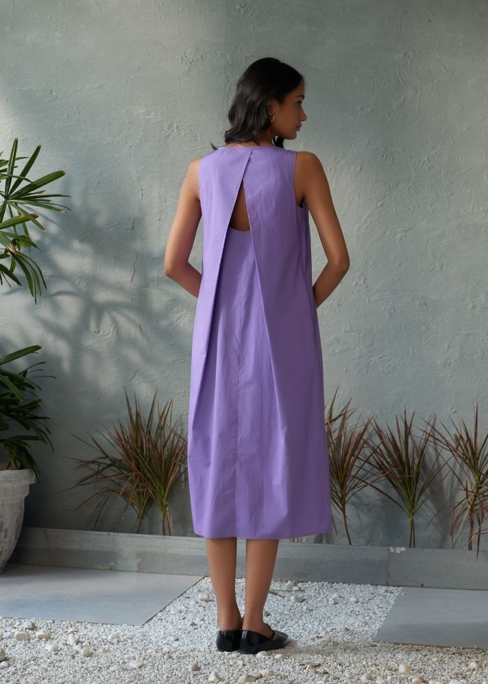Elevate your wardrobe with our sophisticated lavender midi dress, designed with a U scoop neck and distinctive box pleats in the front for a structured yet elegant look. The overlapping back panel with a keyhole detail adds a touch of modern chic and allure. Crafted from high-quality fabric, this dress offers a flattering silhouette that gracefully falls to midi length, perfect for a variety of occasions. Whether for a formal event or a stylish evening out, this versatile dress combines timeless elegance with contemporary design elements.
