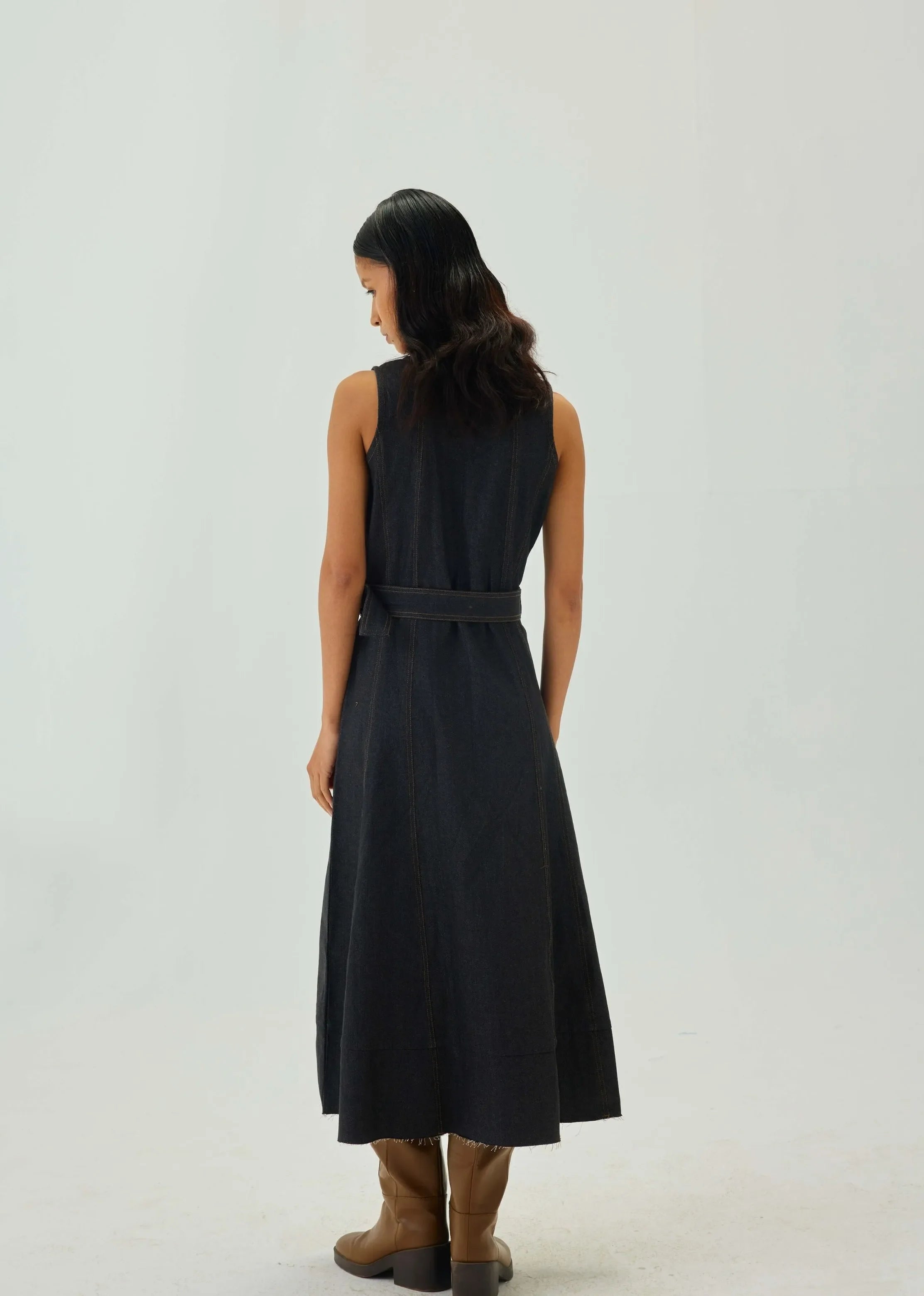 Sleeveless black denim midi dress with a V-neckline, front button closure, flared A-line silhouette, with belt and side pockets
