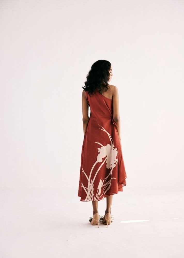 No Return No ExchangeDesert rose dress combines comfort with effortless beauty, an ideal choice for a fuss-free summer day. this one shoulder dress is adorned with a print on brick red soft cotton mul. Handcrafted in India One shoulder dress Fully Lined
