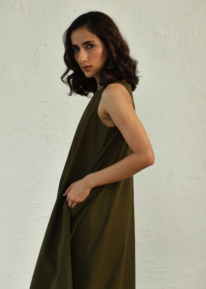 Elevate your style with our earthy green sleeveless midi dress. Crafted from premium cotton poplin fabric, it features a round neckline, deep shoulder cuts, and a u-shaped hemline that adds movement as you walk. Embrace this refreshing and comfortable look for your swift urban escapades, making a bold style statement.