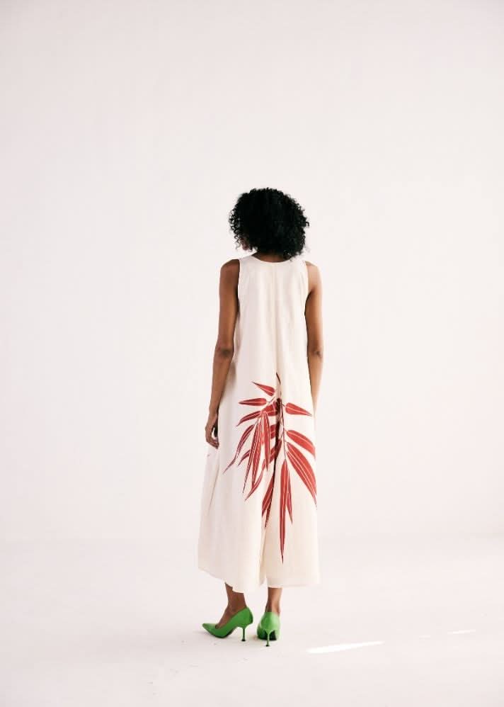 No Return No ExchangeAn off white signature fern printed jumpsuit with a front zipper opening and v neckline in classic A line silhouette. crafted in soft breathable cotton mul. Off White Jumpsuit - Handcrafted in India. - Side seam pockets. - Fully Lined.