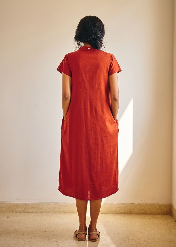 No Return No ExchangeA brick red relaxed fit dress featuring a v neckline crafted in cotton mul Created to mirror the fire within. Handcrafted in India Side seam pockets Separate cold water hand wash. No soaking. Or dry clean .
