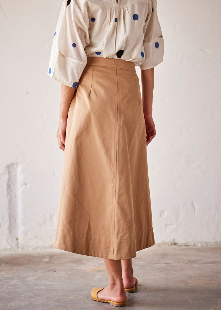 No Return No ExchangeA midi khaki skirt with a center fly opening. - Handcrafted in India. - Side seam pockets.