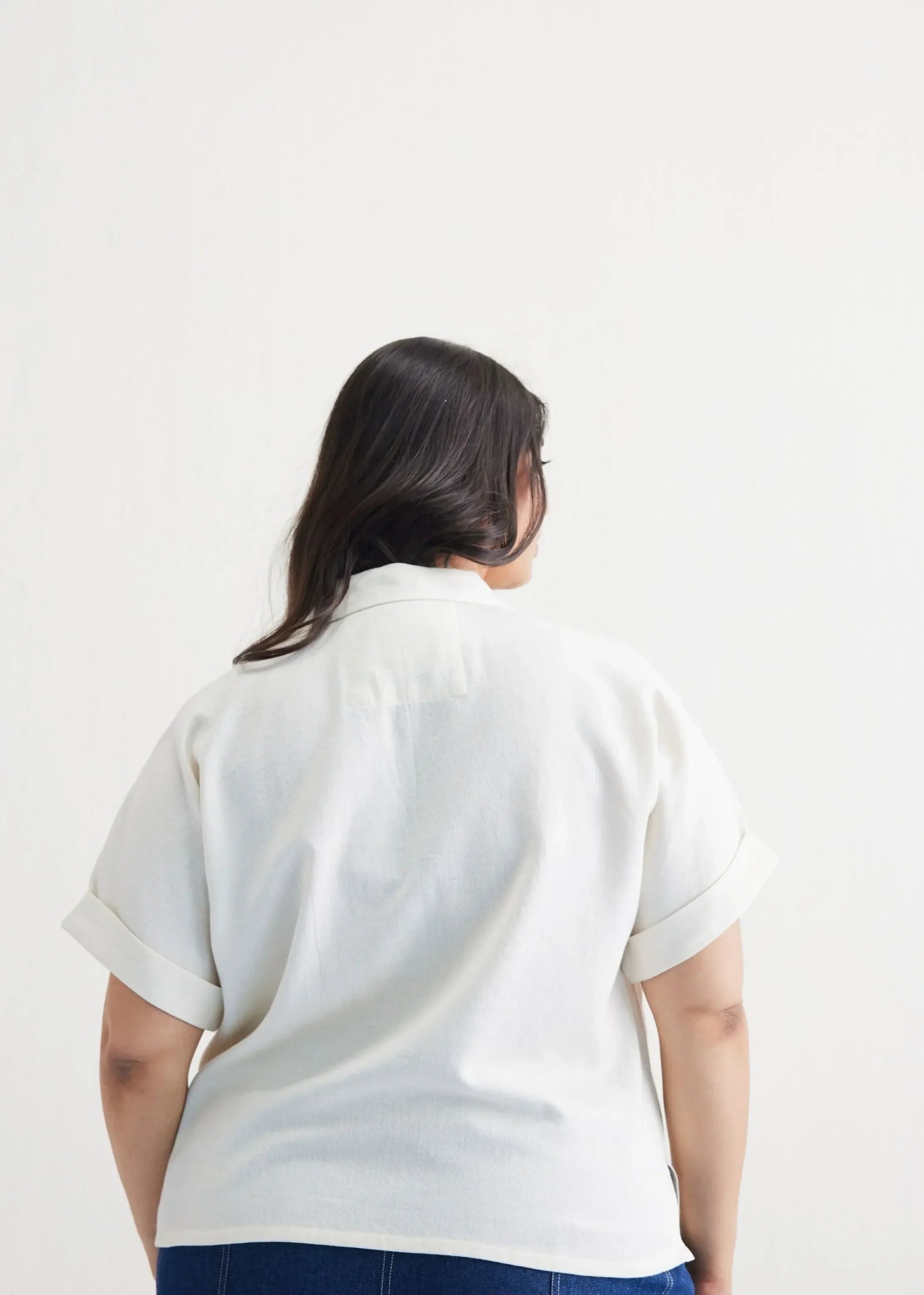 Relaxed fit, half sleeve, v-neck, collared top, crafted in handwoven organic cotton twill fabric, hand embroidered with ocean-inspired and message motifs. This classic, staple top is so versatile and can be endlessly mixed-and-matched to create a fresh outfit each time you put it on.
