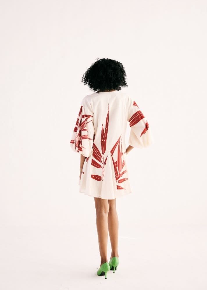 No Return No ExchangeAn off white signature fern printed mini dress crafted in breathable cotton mul with puff elasticated sleeve, V neckline and godet flares at the hemline. Handcrafted in India.
