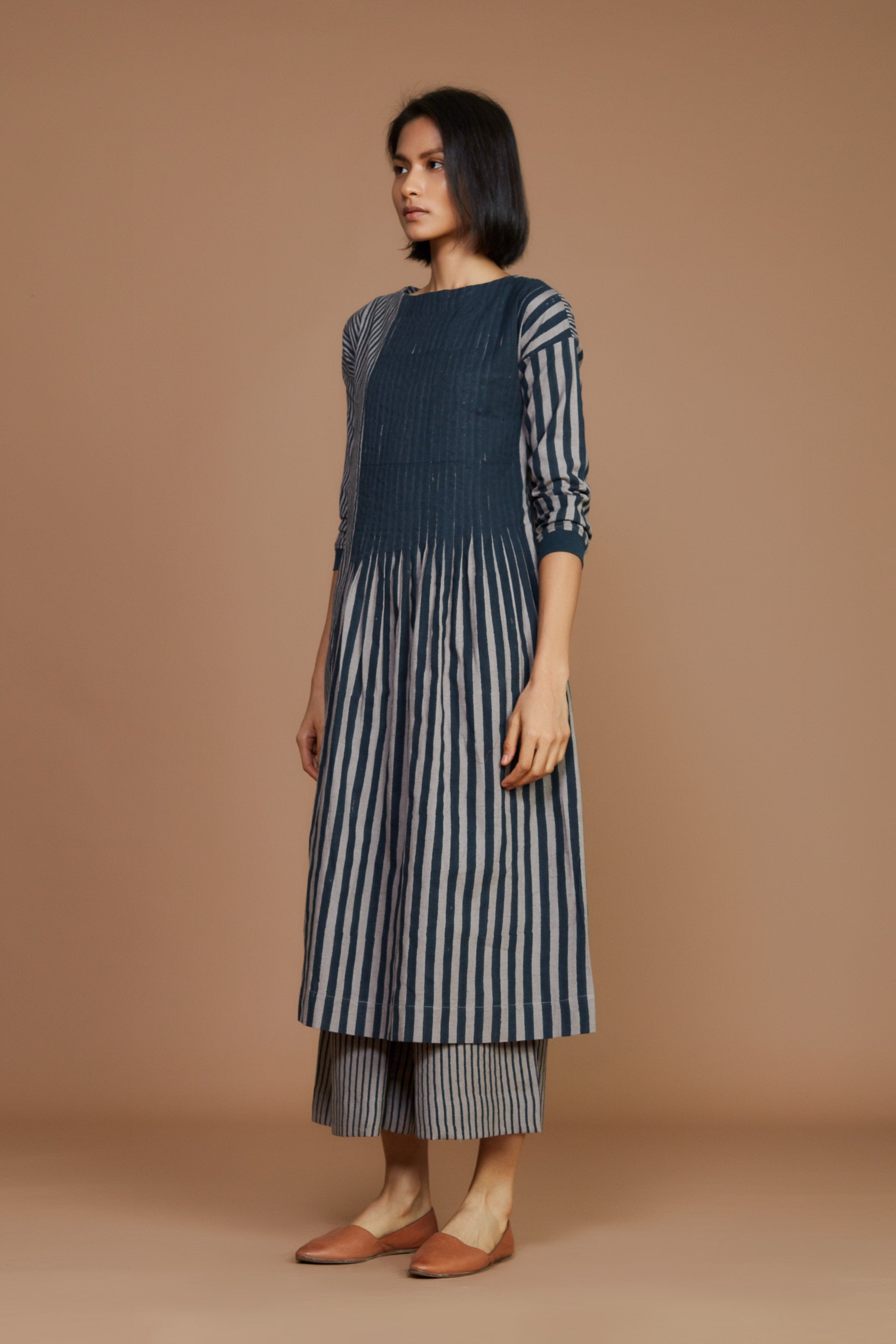 A colour block pattern created by joining the stripes together, this pleated tunic dress gives a nice defined shape around the torso. Complete the set with the matching stripe Re pants. Make it edgier by styling it with black boots.