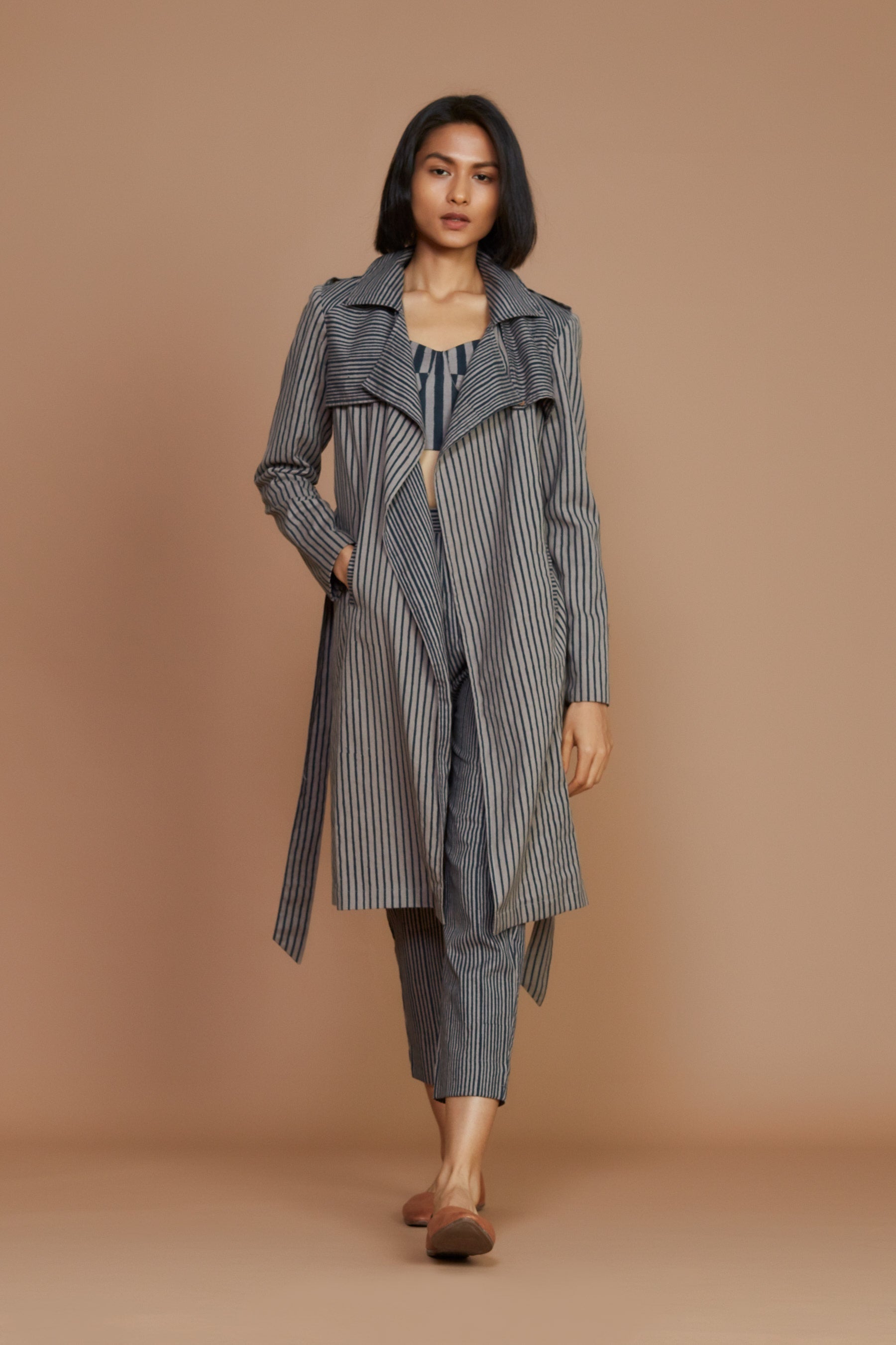 An interesting and modern take on the trench coat. Keep it chic yet sophisticated with this stripe-on stripe. A perfect model off-duty look. The trench includes a double-breasted notched collar and a classy belt detailing at the waist. You can pair it up with a corset and a tapered pants (elasticated at the back) from our collection or style it separately