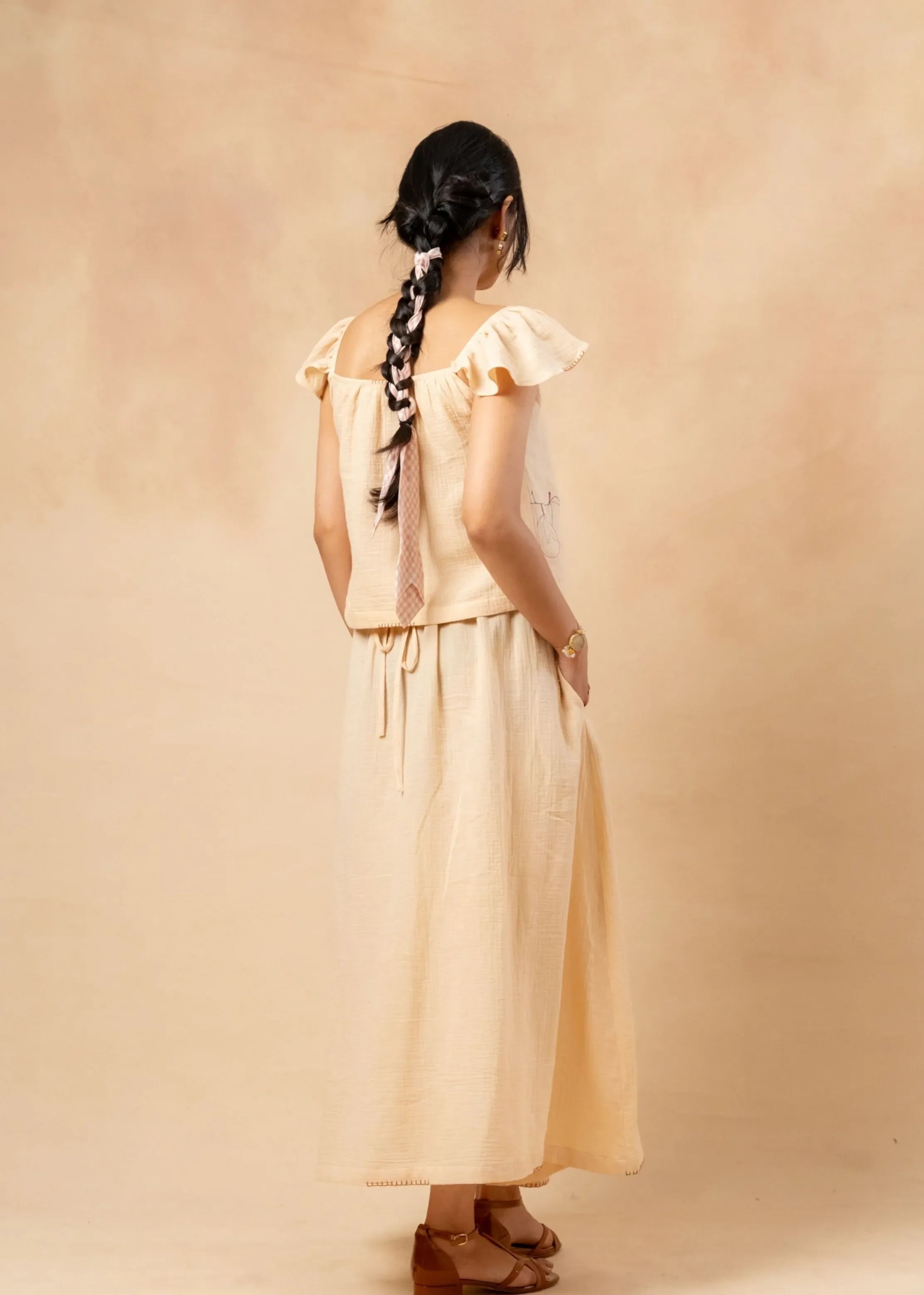 Front pleat with adjustable back with drawstrings, side pockets, hand detailing and randomly placed doodle embroidery. Made in hand dyes azo-free colours with organic cotton material Each piece may come with an extra patch or embroidery to save as much fabric as we can.