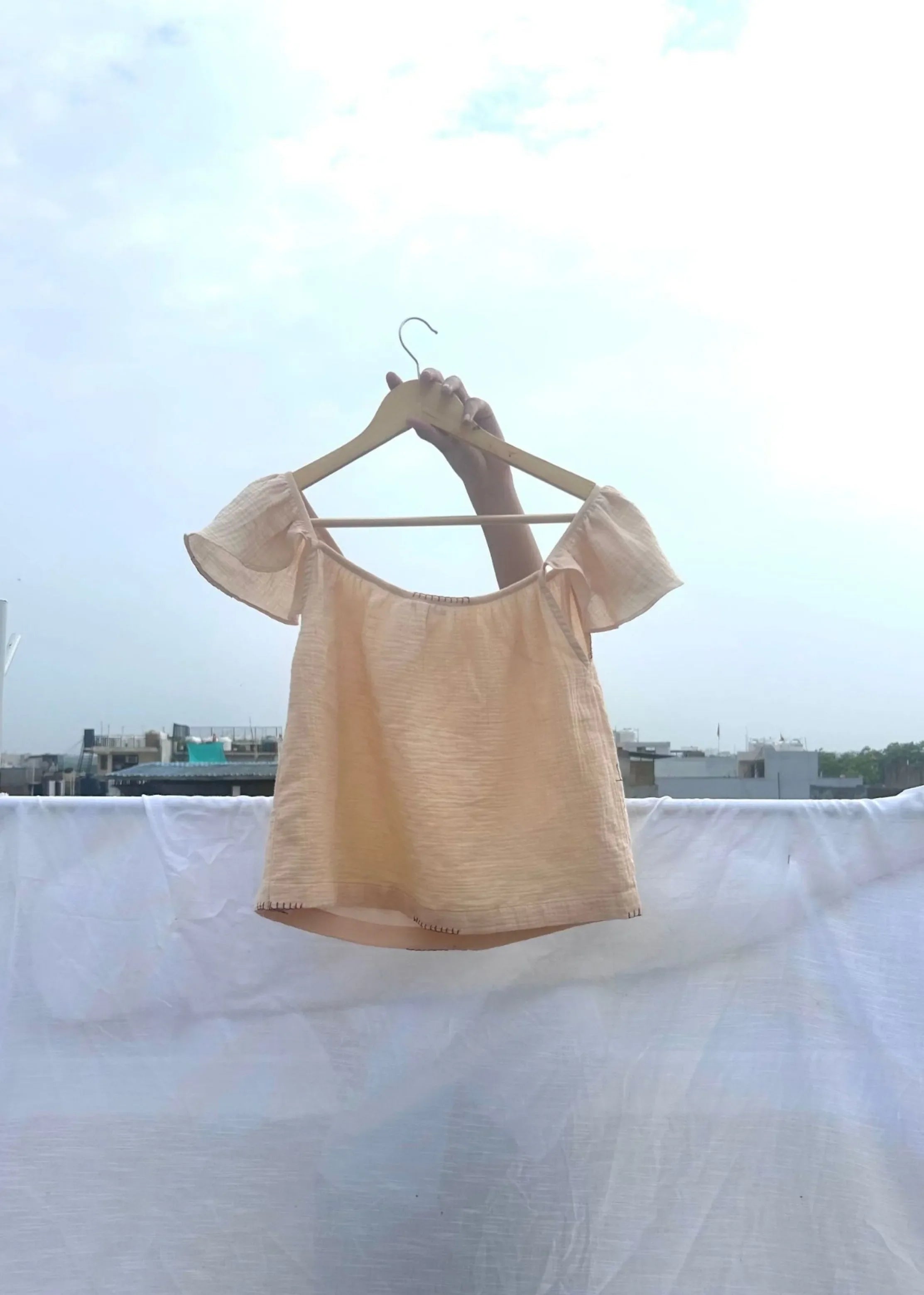 Short mega sleeve, can be styled with off shoulder, summer crop top with randomly placed doodle embroidery. Made in hand dyes azo-free colours with organic cotton material Each piece may come with an extra patch or embroidery to save as much fabric as we can.