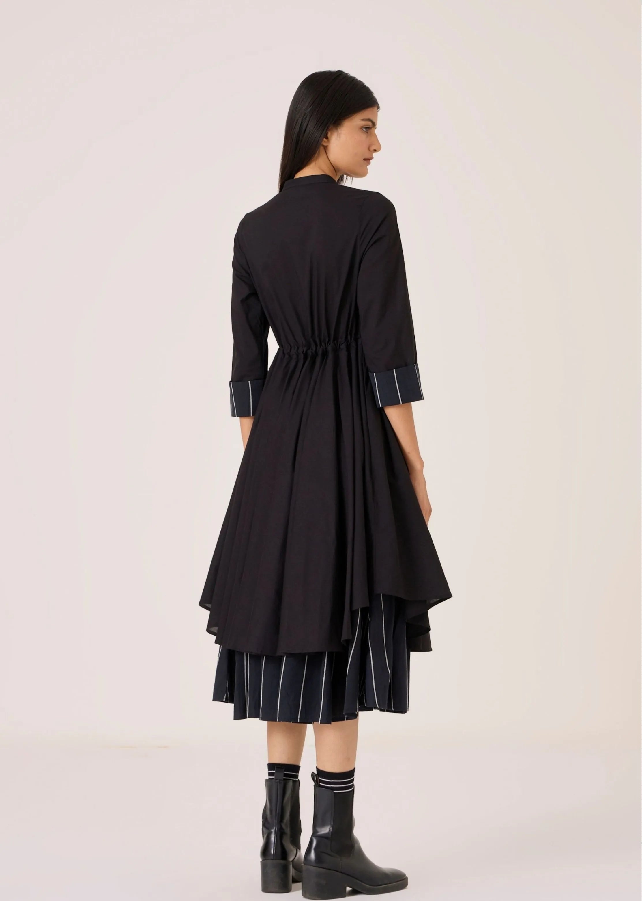 - Layered statement dress - Front placket with neat drawstring at waist - Stripe detail at cuff and hem - Discreet in-seam pockets