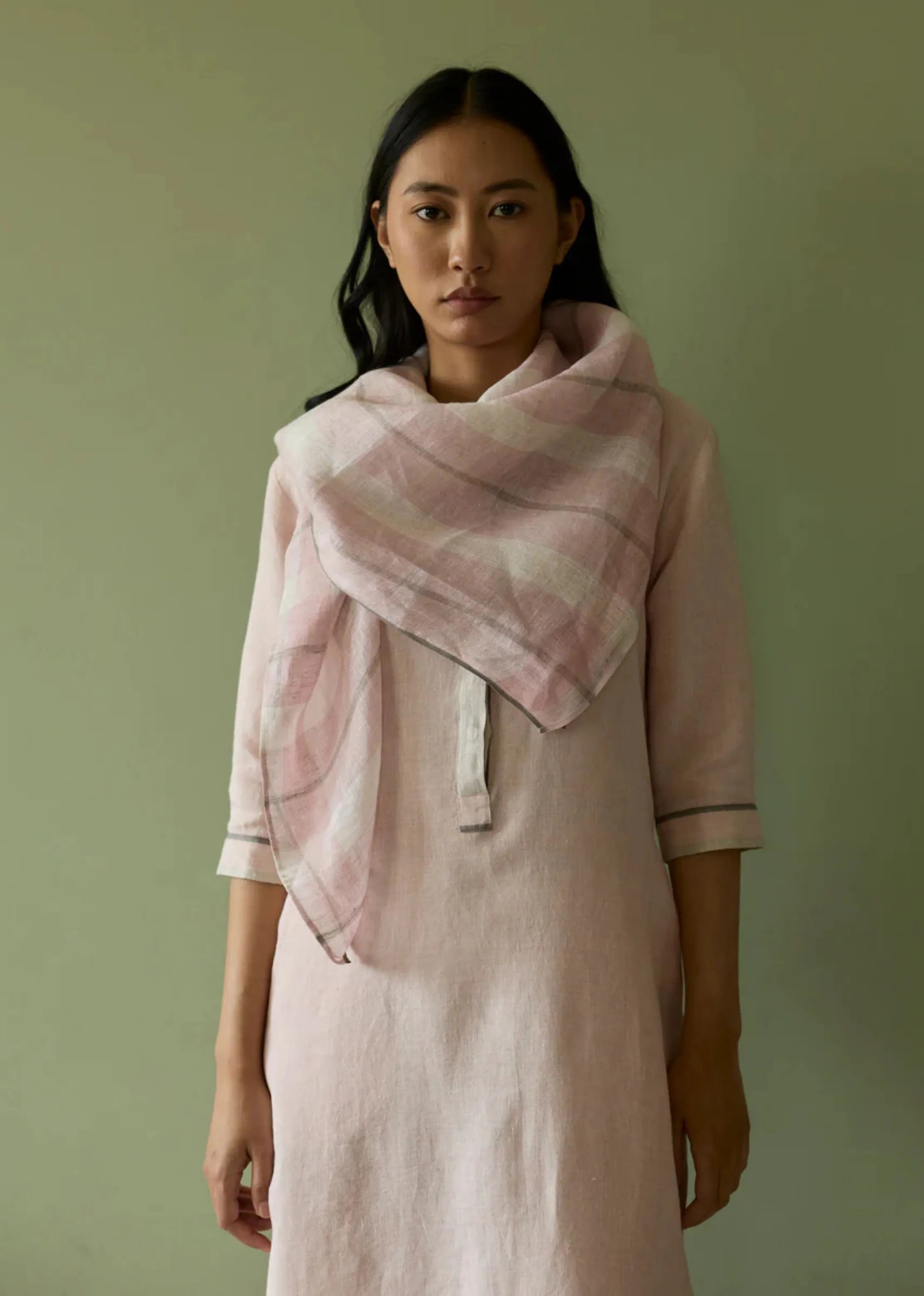 A soft handwoven pure linen scarf with woven multicolour stripes in ivory and soft grey with ivory slevedge woven detail - pair it with our dresses or co-ord sets.