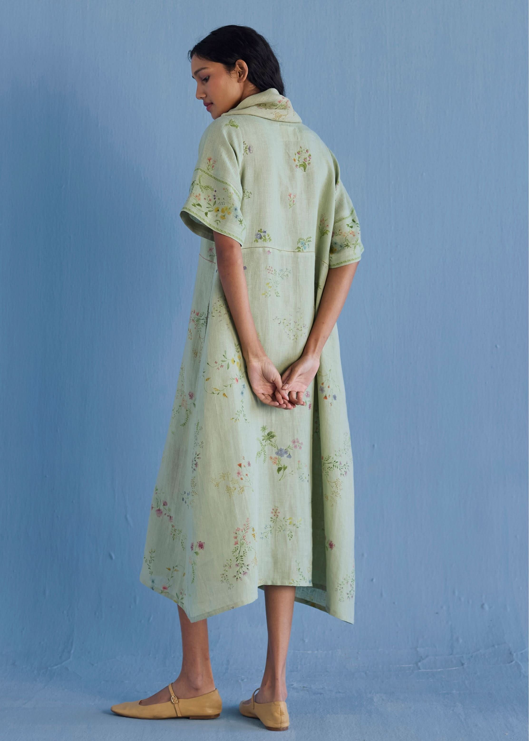 One of our timeless favourites - the cowl neck midi dress handcrafted in our soft yarn-dyed linen with cowl neck in printed soft sheer linen. The dress is designed in two hand-painted floral prints - a jaal floral print and a buta (motif) floral print. Accented with pop coloured fagotting stitch detailing in the front and back and finished with a printed border detail on the sleeves and pockets.