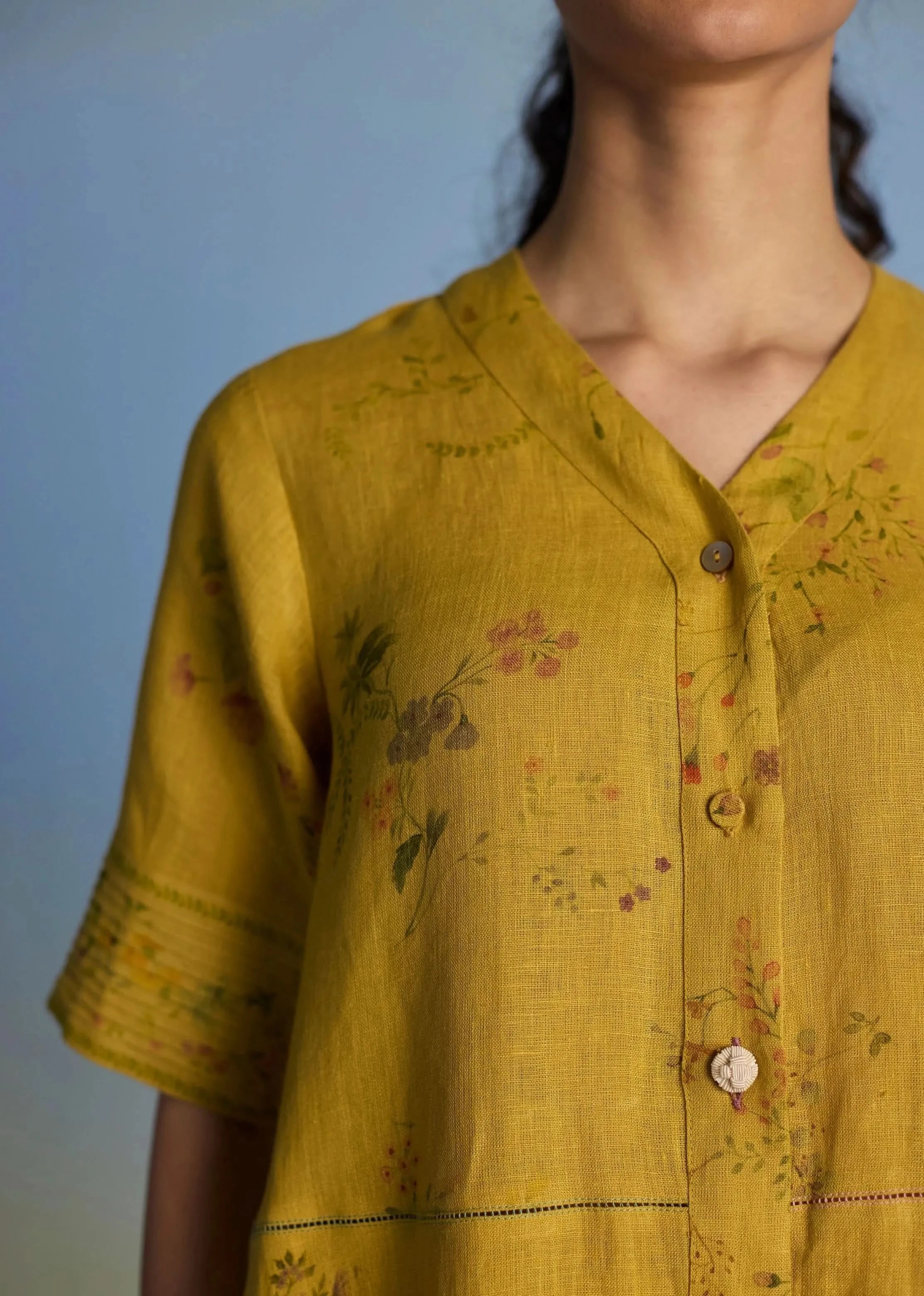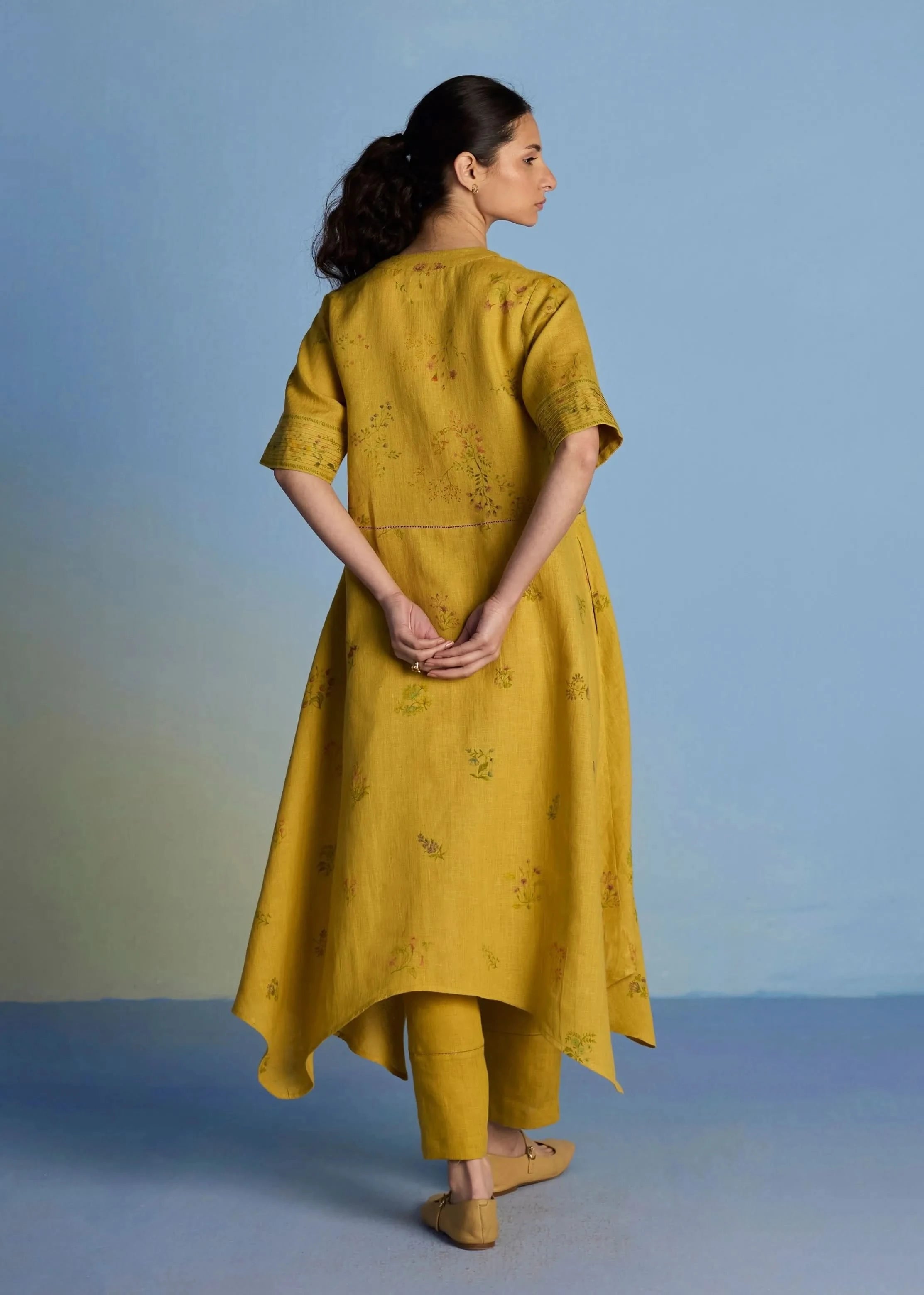 Kurta - A unique button down shirt kurta crafted from our signature soft yarn-dyed linen printed in two hand-painted floral prints - a jaal floral print and a buta (motif) floral print - finished with an up-and-down curved hemline, pockets and linen fabric buttons and a crochet button. The Inoya shirt kurta is accented with pop-coloured hand fagotting stitch details on the front and back. Pant- A timeless tapered pants with pockets, elasticated back waistband and drawstring handcrafted in our signature yarn-dyed linen detailed with a tonal faggoting stitch at the hemline. A versatile fit that can be dressed up or down based on the occasion.