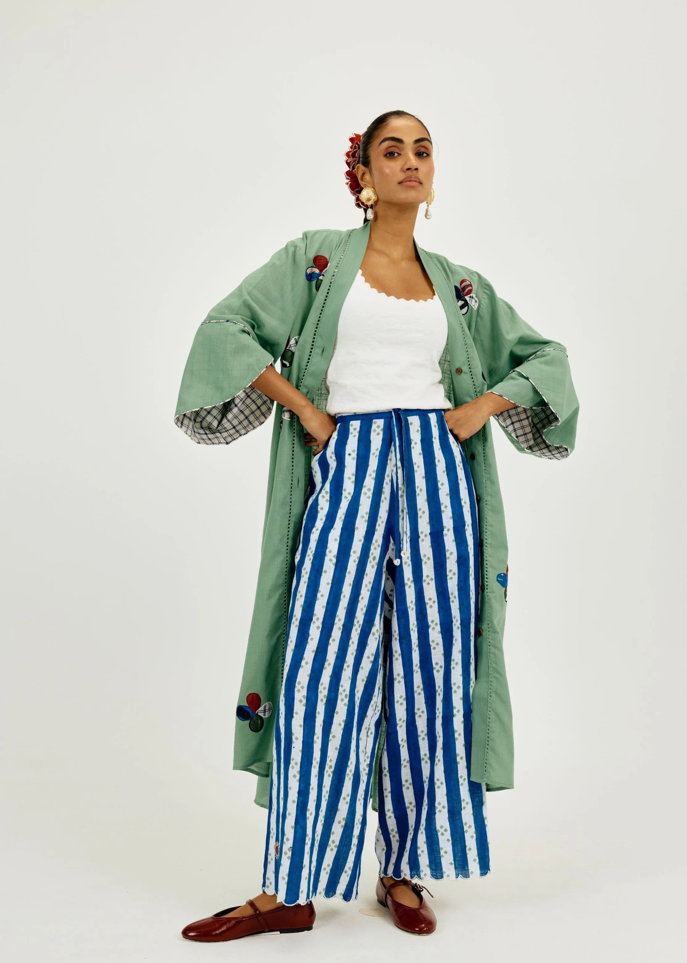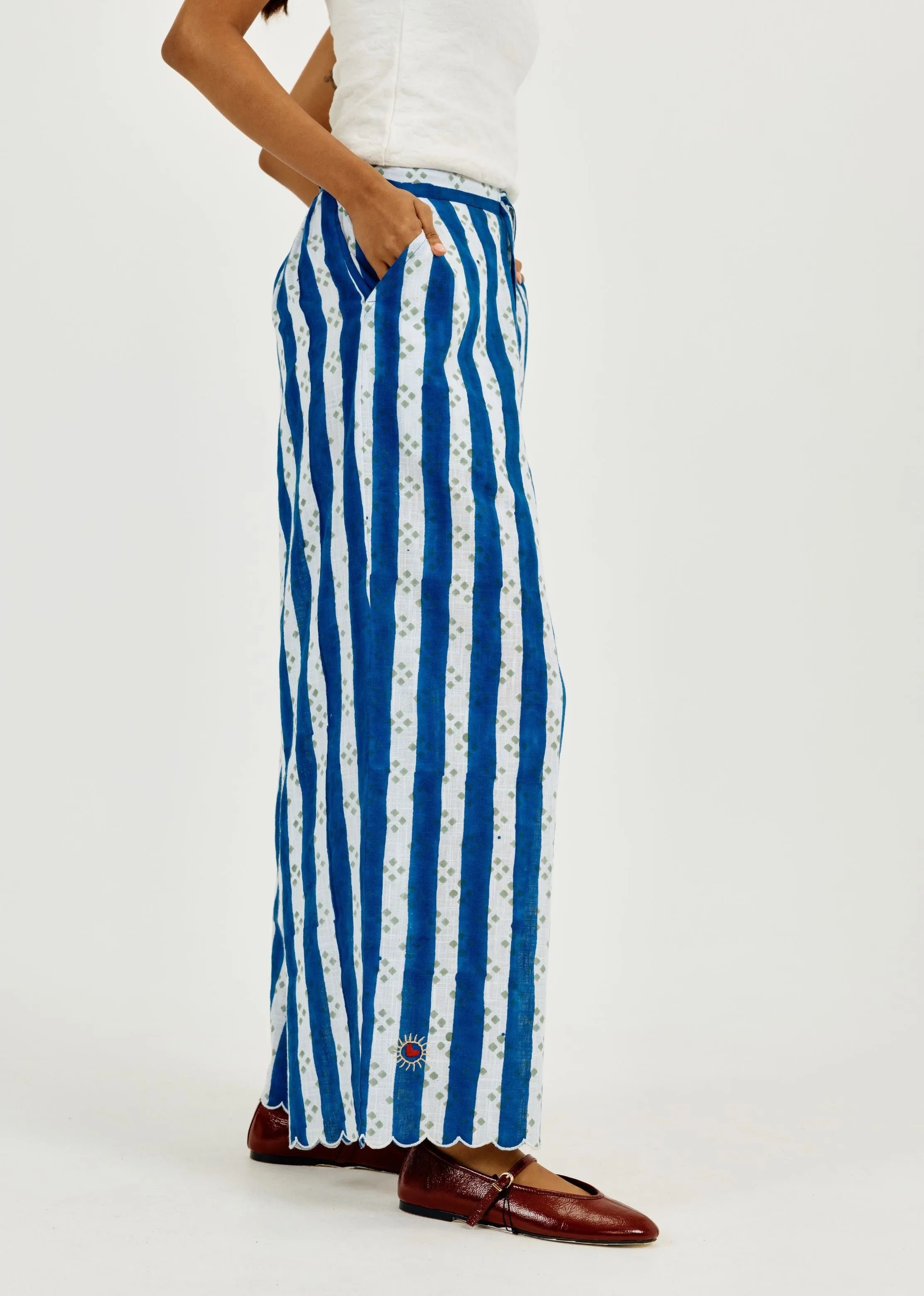 Breezy, bold, and block-printed, these wide-leg cotton pants are your easy answer to summer. Handcrafted in vibrant blue stripes with a floral heart embroidery twist, they feature a comfy drawstring waist and scalloped hem for that extra flair. Pair it with literally everything because stripes are always in season. Our product is printed in Jaipur, India, using techniques of traditional handblock printing with artisanal dyes. Any variations in patterns or bleeding are a mark of the handcrafted process and the nature of artisanal dyeing, adding character and authenticity to your piece. We believe this makes each creation unique and charming. Some call it je ne sais quoi. We call it JODI. If you wish to have any length of the garment altered, please mention your request in the special instructions section at checkout, with your desired length, customisation charges may apply.
