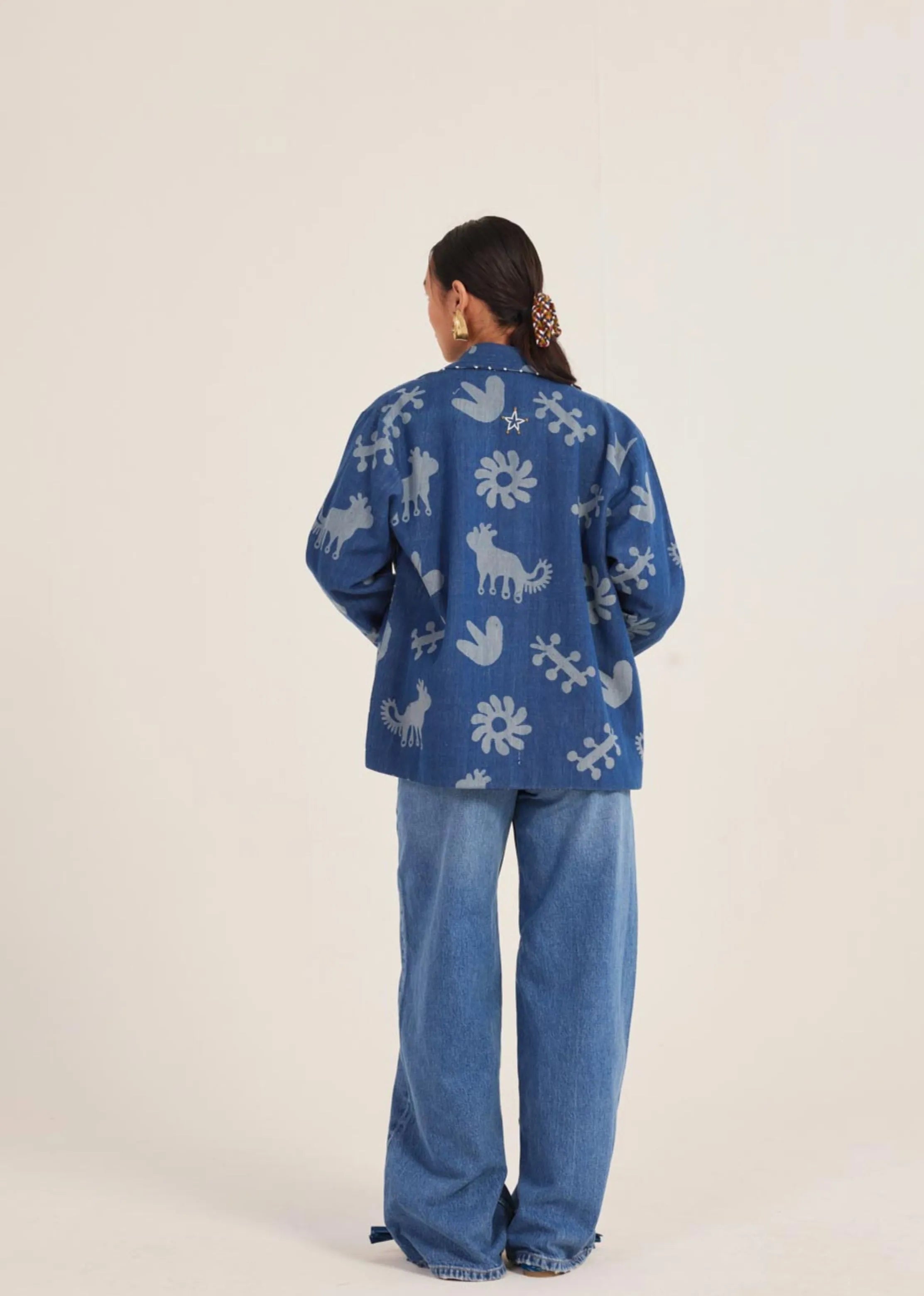 We can't resist a good reversible jacket! We’re back with another, this one’s laser printed denim on one side with hand embroidery highlighting the motif. Flip it and you get handblock printed in muslin silk on the other side. Basically, it’s two outfits in one!