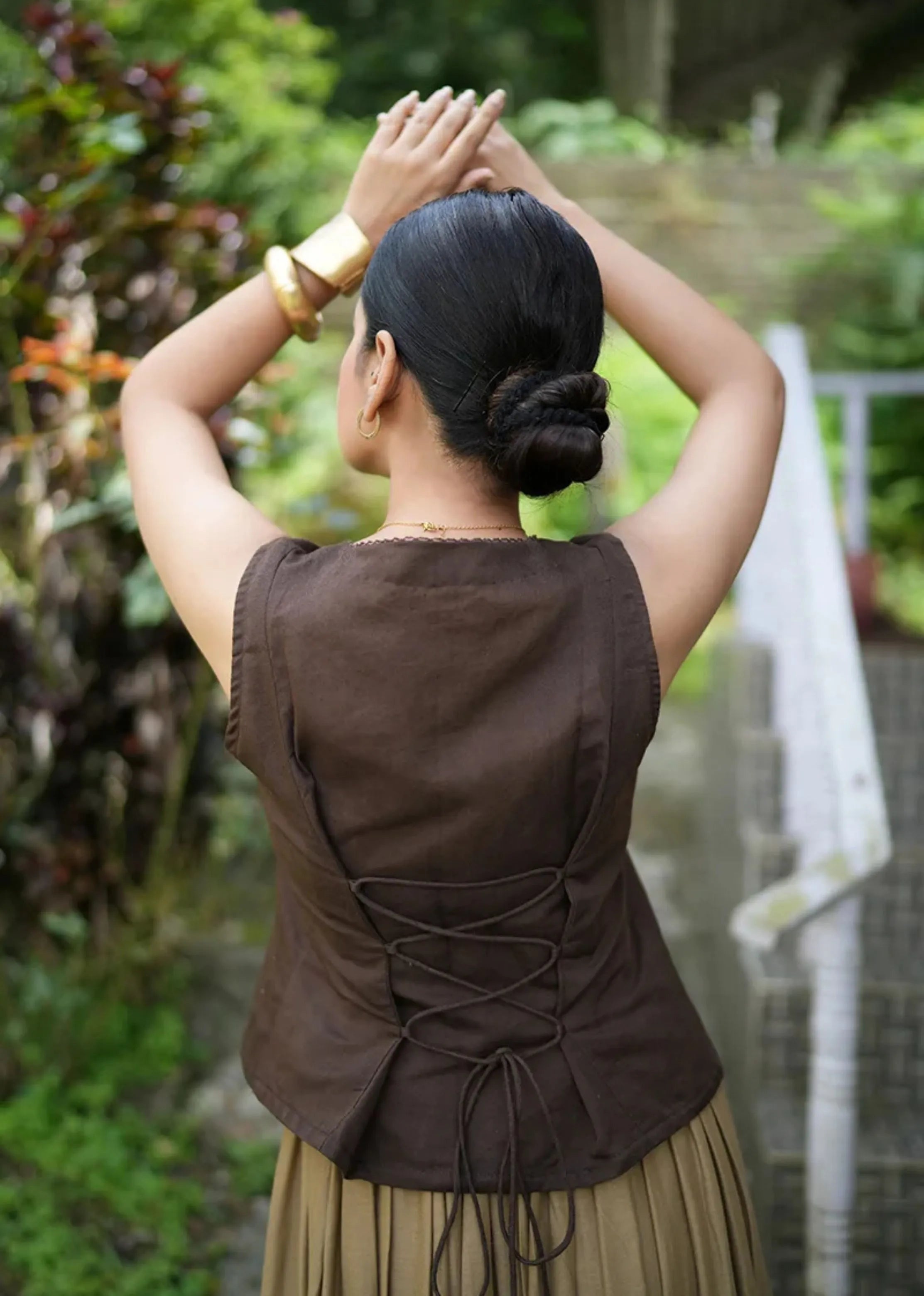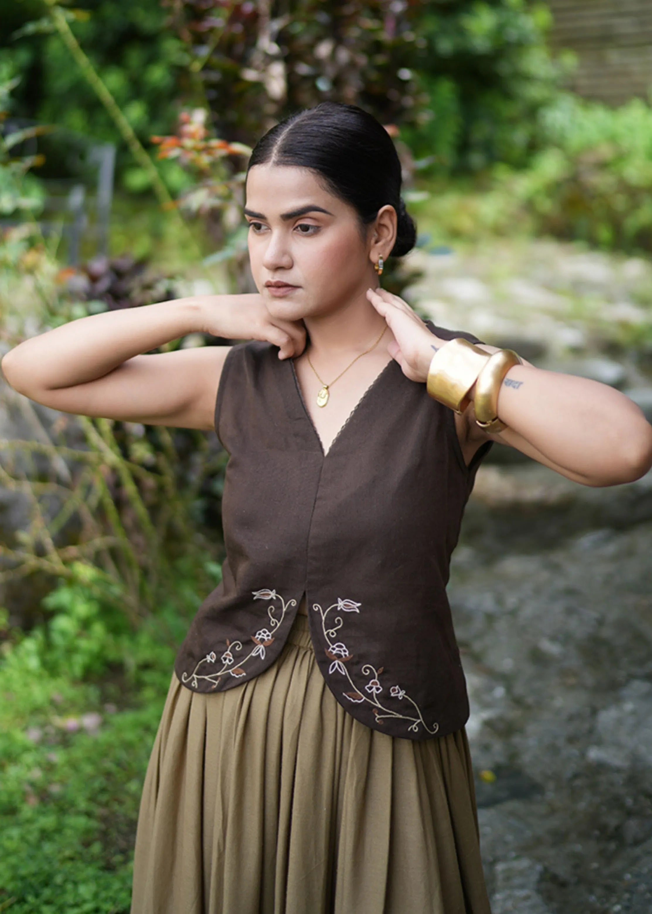 The Isabella top is crafted from linen fabric and features a floral hand-embroidered detail on the front, along with a delicate lace neckline. It has an adjustable drawstring back, allowing for a customized fit.