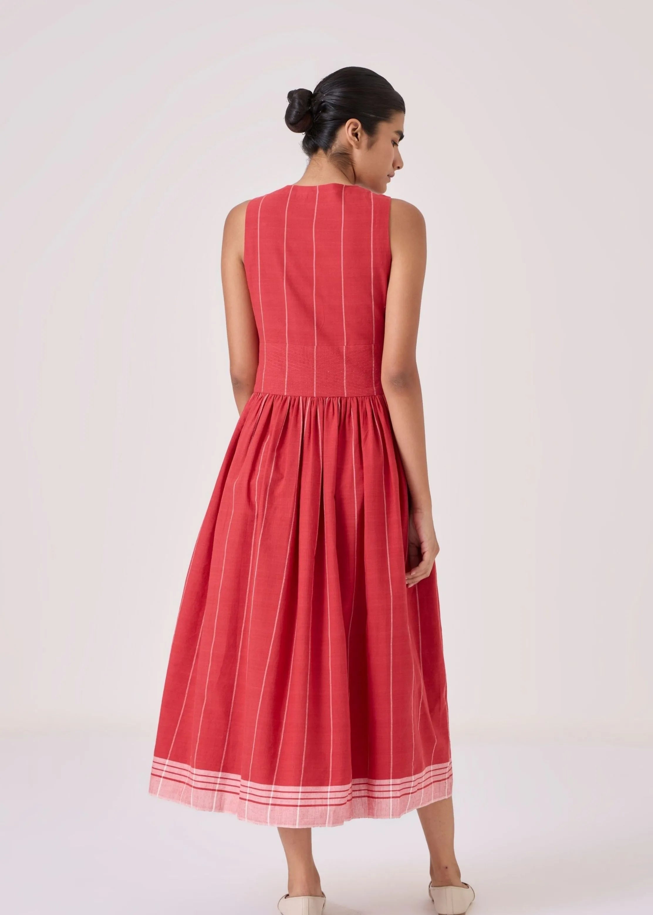- Sleeveless midi dress - Fitted bodice with full flare skirt - In cut shoulders - Quilted waistband detail - In-seam pockets - Side zip - This dress is fully lined