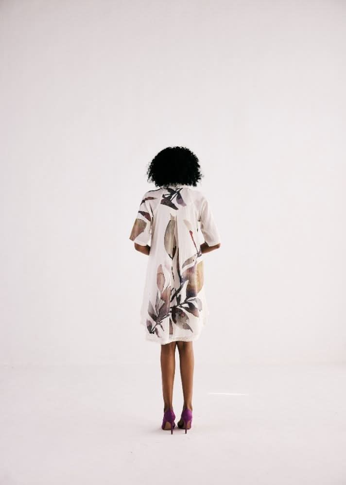 No Return No ExchangeAn off-white floral art print mul dress with lapel collars, front button opening, raglan sleeve and back pleat detailing. Comes with polka dot mul lining with lace detailing . Handcrafted in India Side seam pockets. Polka dot lining.