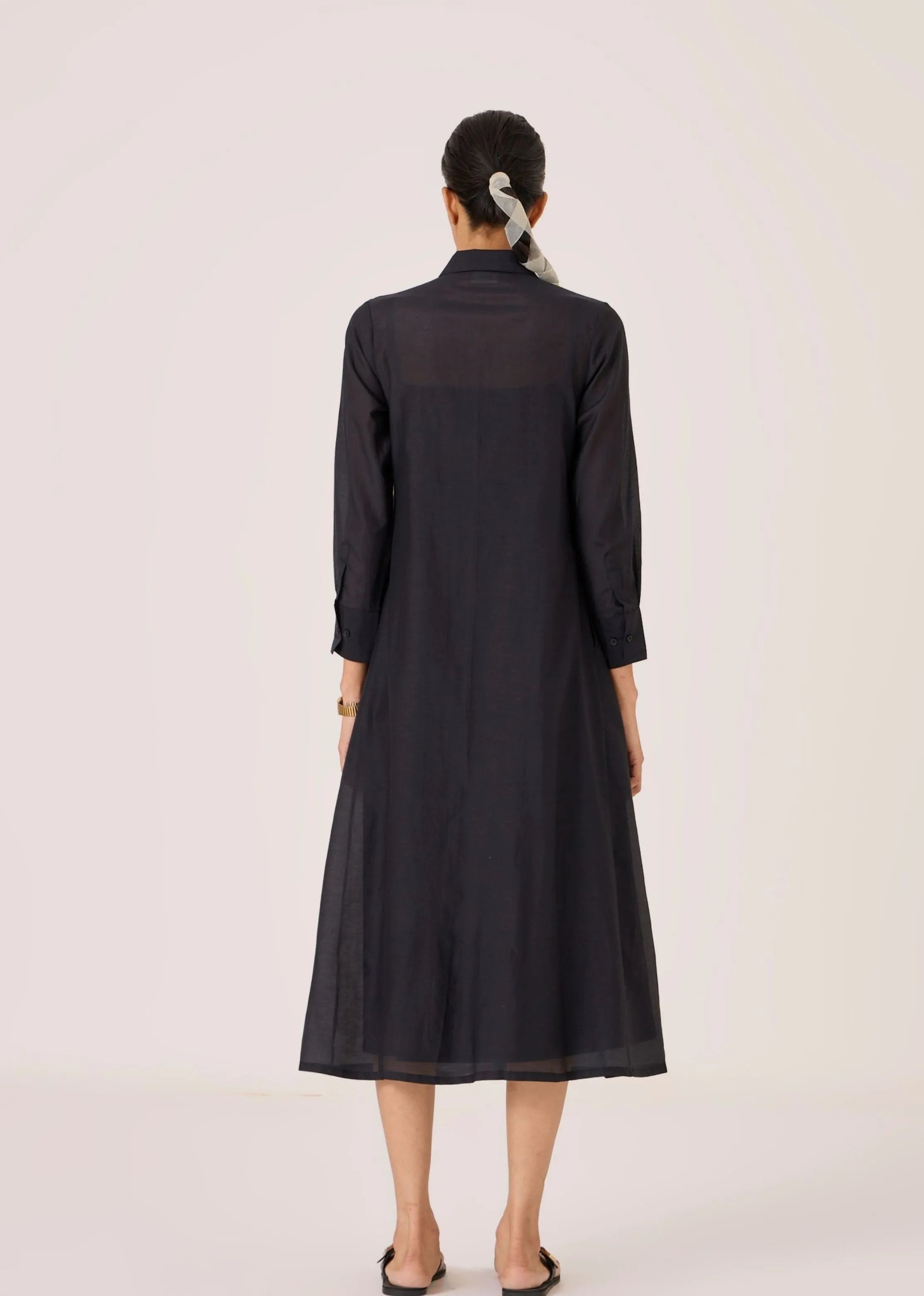 - Button down shirt dress - Slim Collar - Inverted box pleat paneling - Cuff details on sleeve - 3/4th sleeves - This dress is shipped with a slip