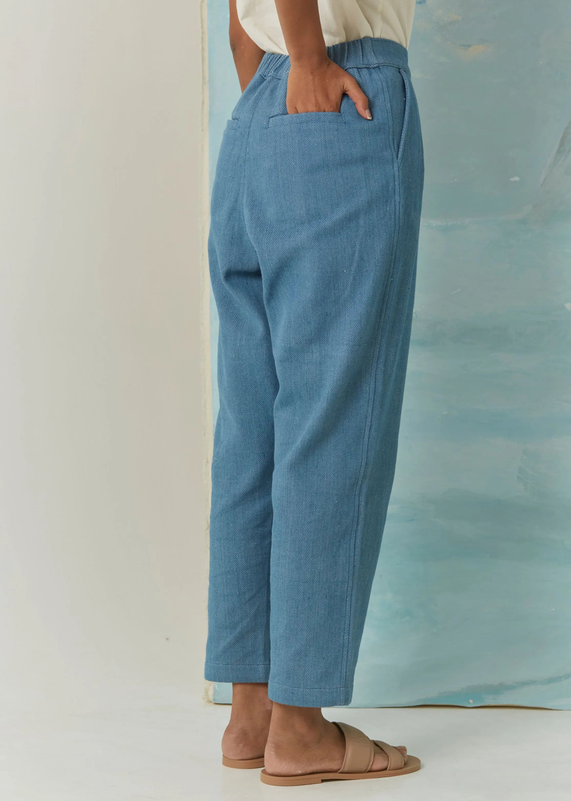 Experience unparalleled comfort with the Kai pant, crafted from 100% handspun, handwoven cotton denim. This unique fabric offers a distinctive texture and incredible breathability. Designed for a truly relaxed fit, these pants feature stylish double pleats for a refined look, complemented by a comfortable elasticated back for ease of wear. The rich, authentic hue comes from being yarn-dyed with natural indigo, a sustainable and beautiful choice.