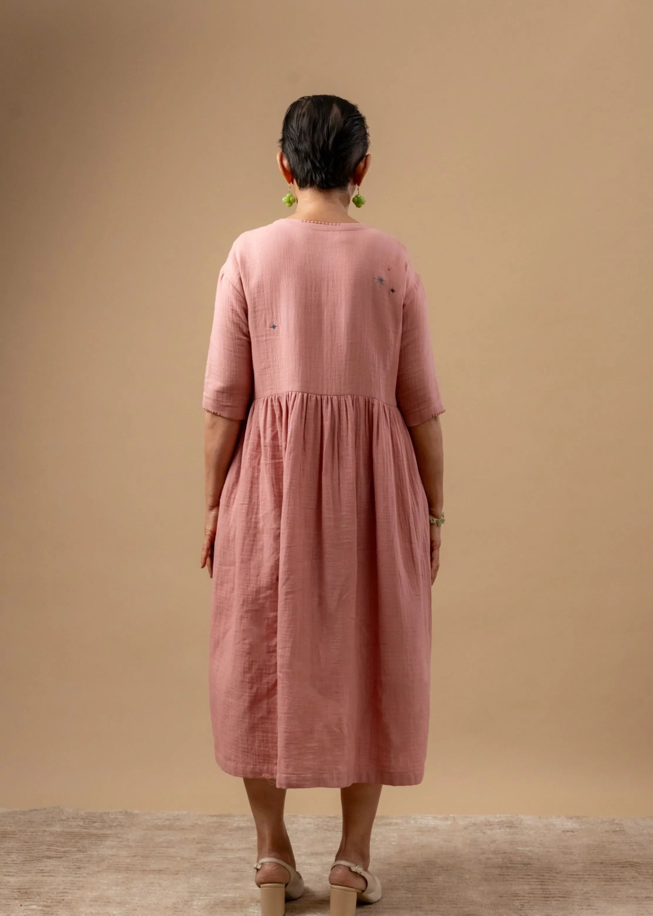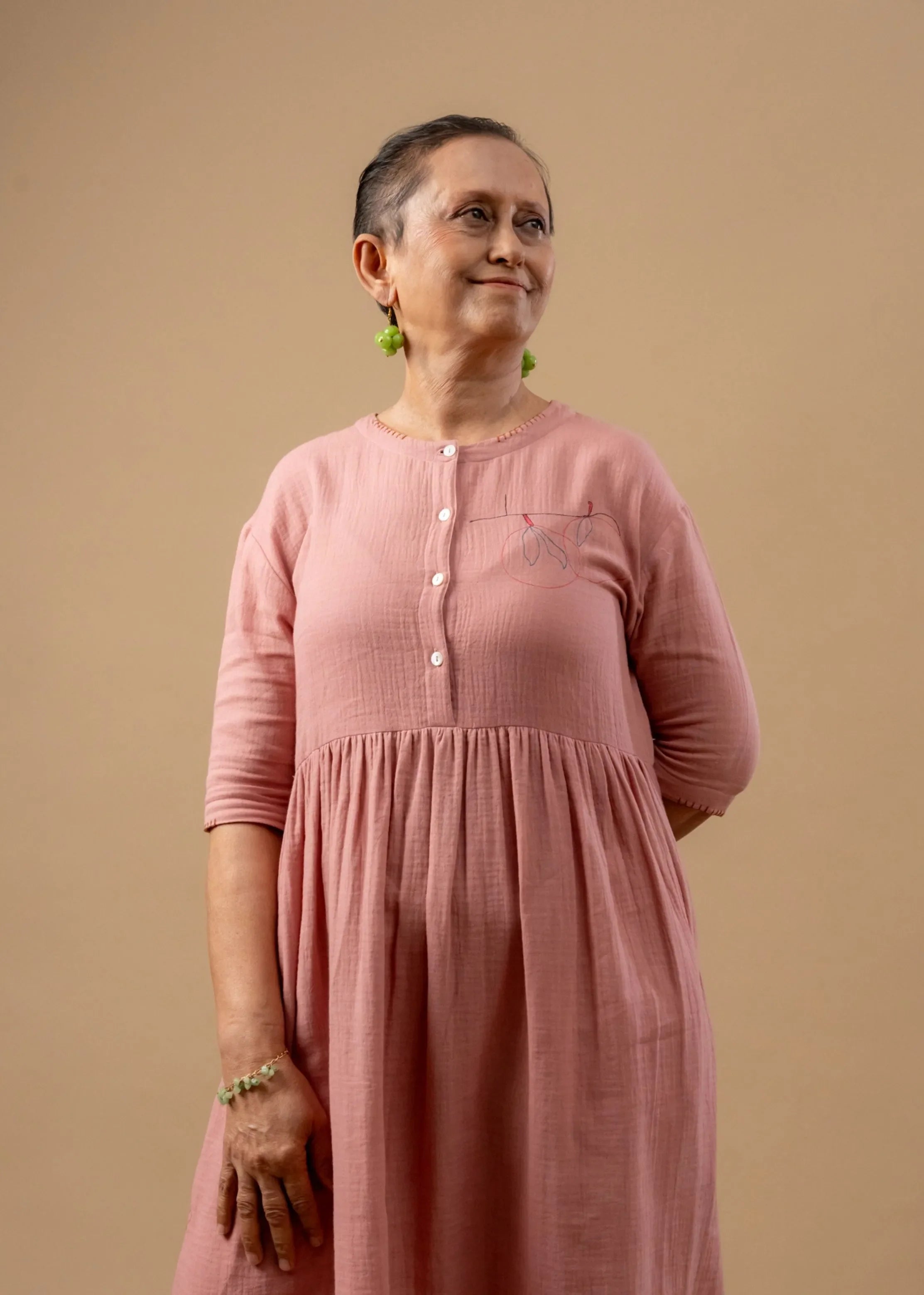 Oversized organic cotton dress with gathers, button details, randomely placed doodle embroideries and side pockets Each piece may come with an extra patch or embroidery to save as much fabric as we can.