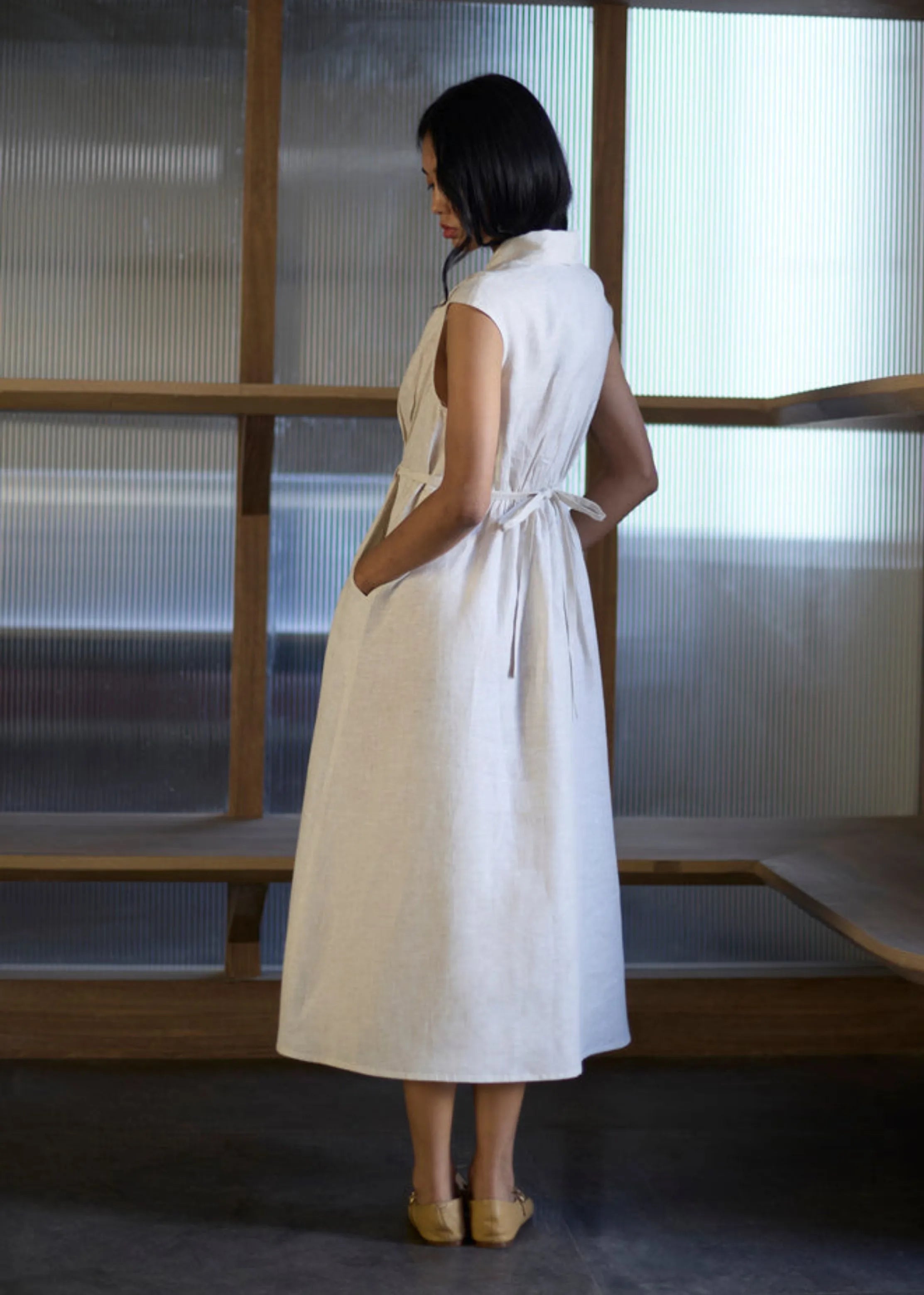 Our favourite contemporary shawl collar midi dress is handcrafted from our signature yarn-dyed linen. Gathered thoughtfully at the waist, the Kara Dress has comfortable pockets and can be dressed up or down depending on the day.