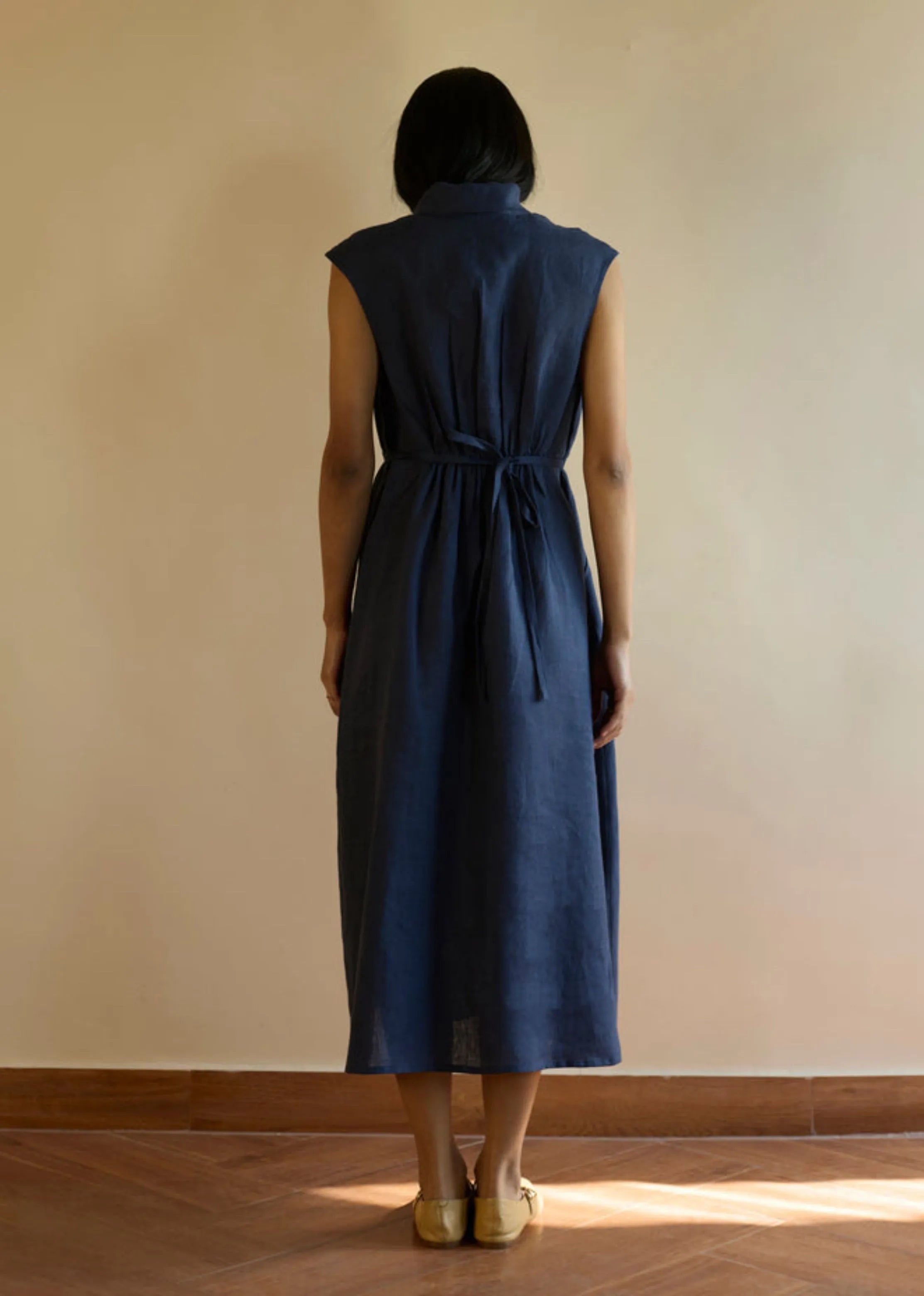 Kara Shawl Collar Linen Dress- Navy